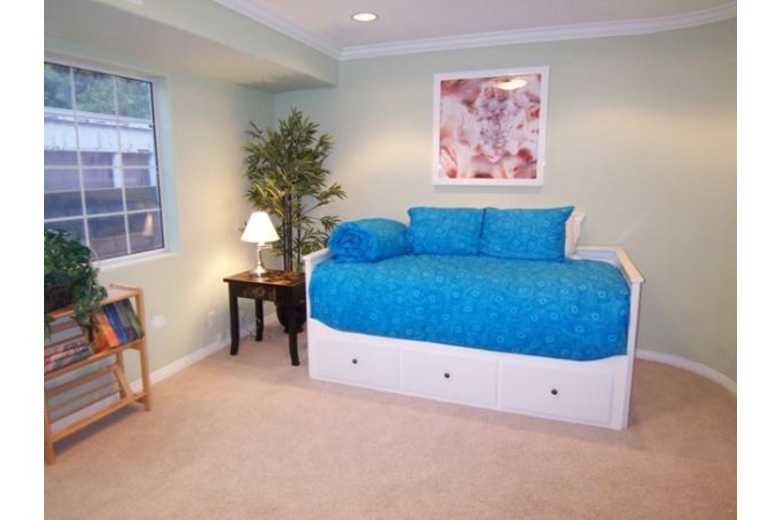 The first floor entrance opens to a tiled hallway with a laundry room with washer/dryer and separate laundry sink. The first bedroom opens off the hallway and includes a trundle bed. Continuing down the hallway leads to a spacious bedroom with queen bed and overstuffed love seat. There is a 32" flat screen TV and a walk-in closet. An attached bathroom has a jacuzzi tub, a separate glass shower, 2 sinks, separate toilet room and large windows for lots of light.