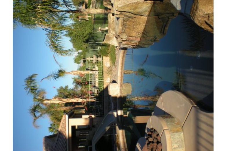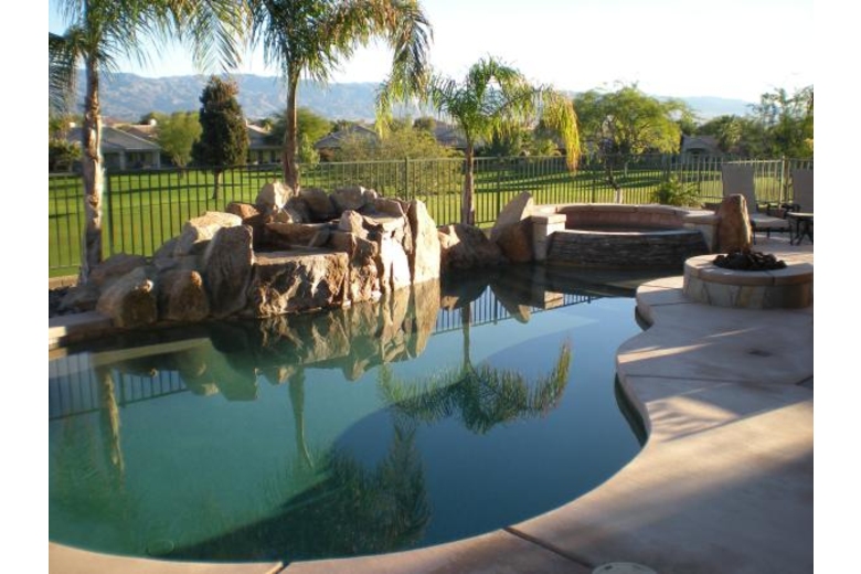 This professionally decorated, 2200 square feet, single family home was part of the Indian Springs Golf and Country Club model home park. It is located on the most beautiful hole of the golf course with a magnificent view of the mountains, a waterfall, and a lovely pond area surrounded by flowers. The outdoor entertaining area features a 4-year old beautiful salt water pool with raised rock spa and a gas fire pit. The pool slide and jumping rock are favorite pool features for kids.