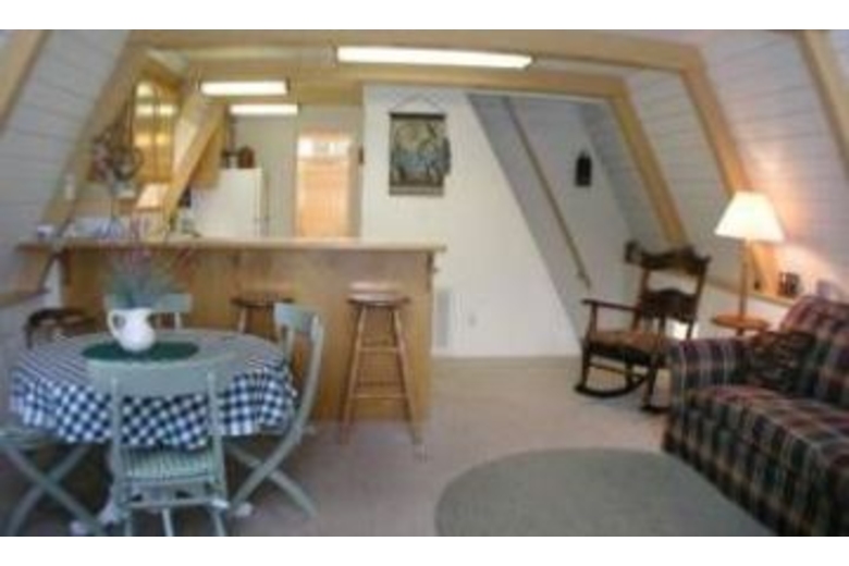 This quaint "A" frame chalet has windows from floor to ceiling and a loft that looks out at the lake. It is immaculately maintained. This chalet is available for families, friends, and co-workers who want to vacation together but like the privacy of separate units.