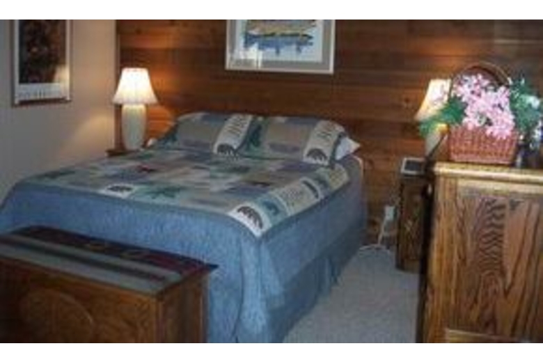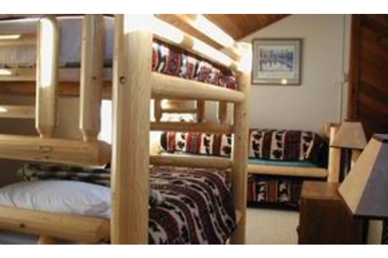The living room has a 32" TV with VCR/DVD, stereo with CD player, wood burning insert fireplace and open beam ceilings. Off the living room there is a sunny deck with slight views of the Sherwin Mountain tops. Both bedrooms have attached private bathrooms and televisions. The master bedroom has a walk-in closet. The loft has a great log bunk and trundle bed. Guests are provided with free long distance and high speed cable internet while staying in this condo. Enjoy the pool and Jacuzzi, just steps from the front door. There are a maximum of two cars permitted. The master has a queen bed, the second bedroom has a queen, and the loft has a bunk bed and 2 twins.Surrounding Description