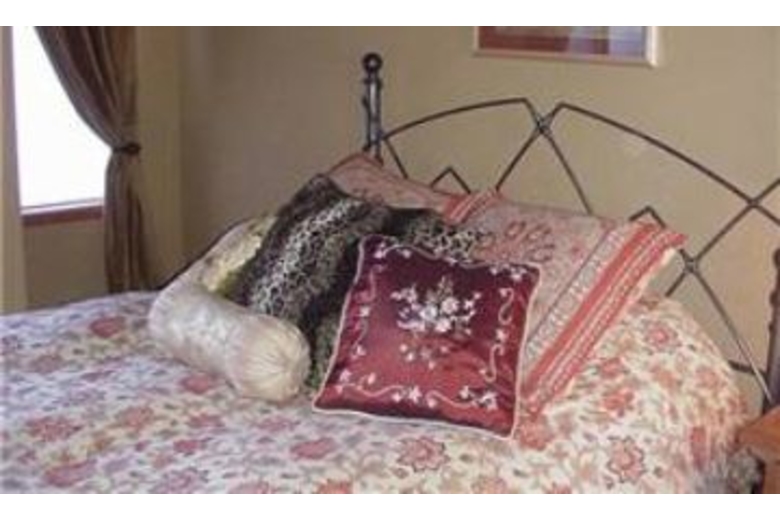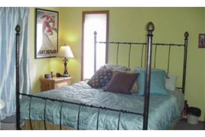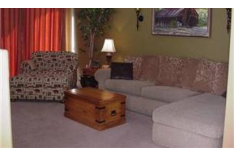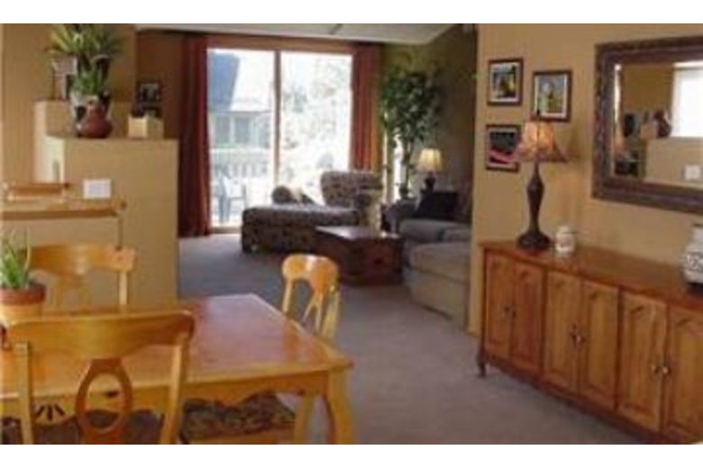 This three bedroom, three bath townhome can sleep up to eight people comfortably. There is plenty of space to spread out when you want to relax. The townhome also has a TV, washer, dryer, fireplace and CD player. The living area has artificial plants, a couch, chair, framed artwork and a window. The dining area comes with a wood table, four chairs, mirror, lamp and framed artwork. The fully equipped kitchen has a coffee maker, microwave and dishwasher. Inside the master bedroom is a king bed with a blue bedspread, blue curtains, framed artwork, lamp and nightstand. The second bedroom comes with a bunk bed (double on bottom, twin on top plus a twin that pulls out from underneath) and framed artwork. The third bedroom has a window, framed artwork, a queen bed with a floral bedspread and decorative pillows.Surrounding Description