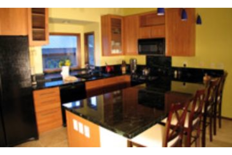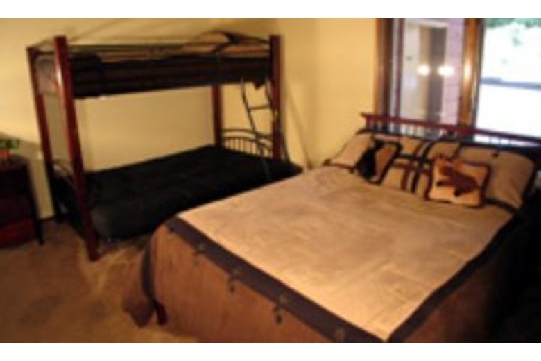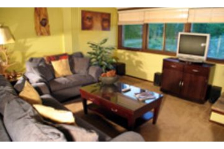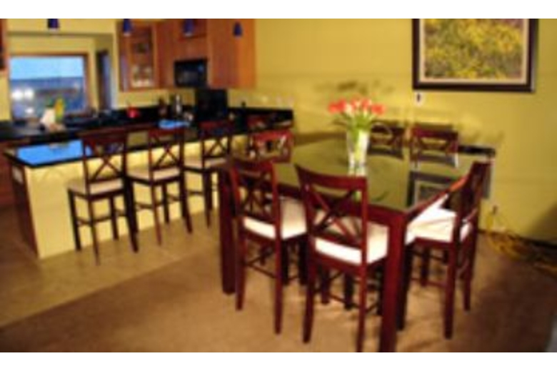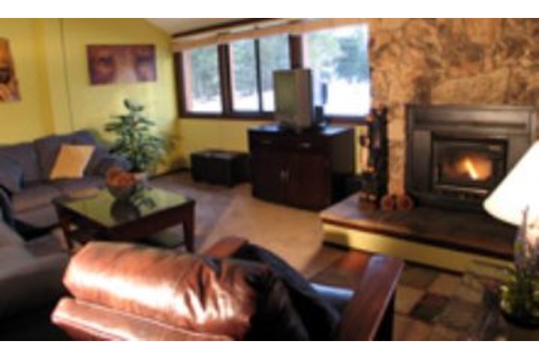 The first master bedroom has a queen bed with great bedding, a full bathroom, and a nice TV. The second master bedroom offers a double bed and a captain bunk bed along with a bathroom. Both of the master bathrooms have great vanities and tile showers. The entire upstairs is an open floor plan. The kitchen is fully equipped and has nice counter tops. The dining table is very modern and seats six, and there is additional seating at the bar. The living area has large windows, nice sofas and a TV/DVD player. There is also a wood burning fireplace.Surrounding Description