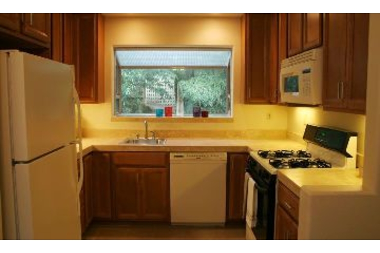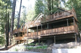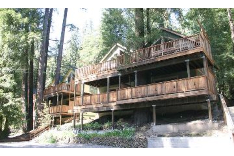 Includes upper and lower grand balcony redwood decks built around 100-year-old Redwood Trees, one balcony for the master bedroom and the other seated above just off the living room--making it ideal for barbecues and outside family dinners. Inside you will find large vaulted ceilings above the spacious living room, TV with cable and DVD/VHS capabilities, large couches for plenty of seating, as well as a cozy remote controlled fireplace. The bathroom is done in tile and stone, with a shower including dual heads on opposite sides. Granite kitchen counters, large bedrooms, and all linens and china included.Surrounding Description
