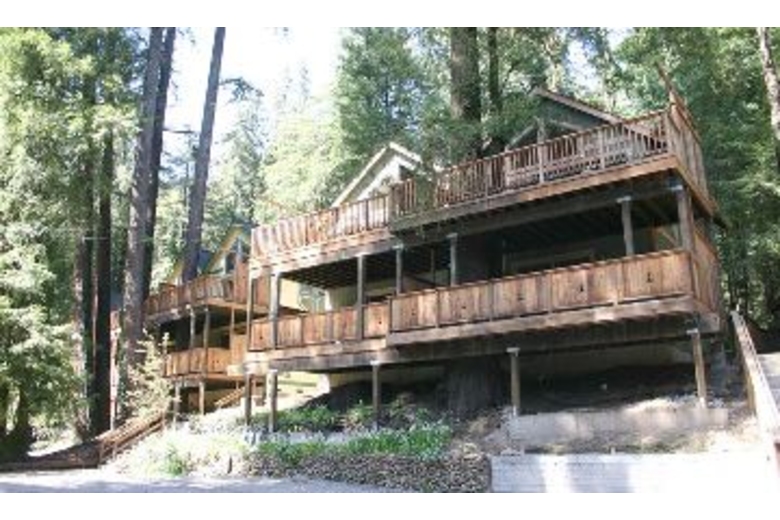 Includes upper and lower grand balcony redwood decks built around 100-year-old Redwood Trees, one balcony for the master bedroom and the other seated above just off the living room--making it ideal for barbecues and outside family dinners. Inside you will find large vaulted ceilings above the spacious living room, TV with cable and DVD/VHS capabilities, large couches for plenty of seating, as well as a cozy remote controlled fireplace. The bathroom is done in tile and stone, with a shower including dual heads on opposite sides. Granite kitchen counters, large bedrooms, and all linens and china included.Surrounding Description