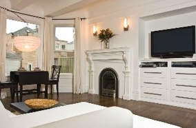 This upscale 1,800 square foot home offers three bedrooms and three bathrooms. You will love the nine foot ceilings, hardwood floors, and beautiful furnishings found throughout this home. The spacious living room is perfect for entertaining with features such as comfortable seating, satellite programming, a large 62-inch HD television, and a gas fireplace. The dining area has a large window with a fabulous city view and a wood table that will seat six guests. The kitchen is fully equipped with all your cooking needs. The bedding has high quality linens and will sleep six guests peacefully on three queen beds provided. The master bedroom has an outside deck that has a scenic view of downtown San Francisco and Twin Peaks. Guests also can enjoy the iPod Dock with speakers and wireless Internet access.Surrounding Description