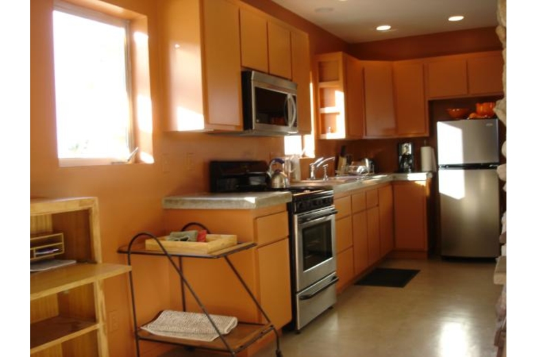 The living room of this pet friendly Joshua Tree home is where you will find the entertainment center with its TV/DVD/VCR, cable TV, video and DVD library for a pleasurable vacation. You can cook delicious dishes in the fully equipped kitchen.