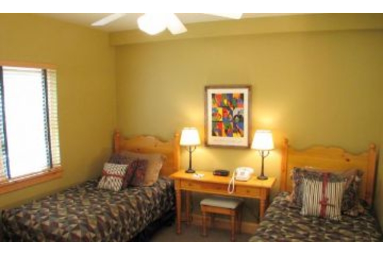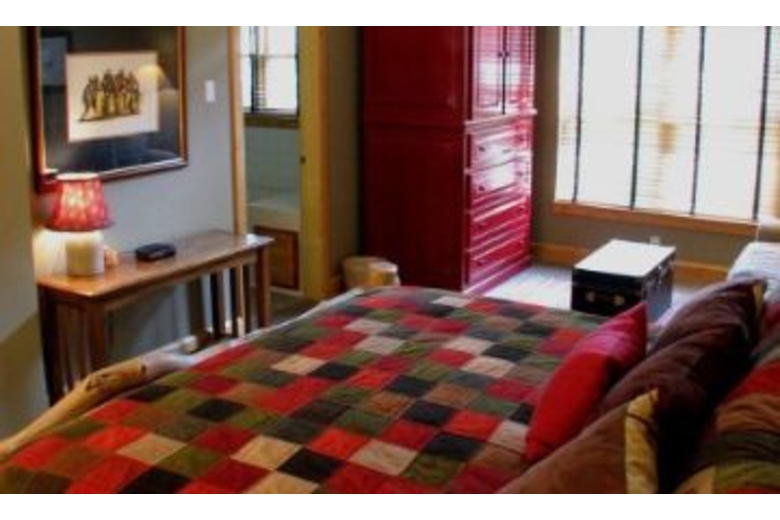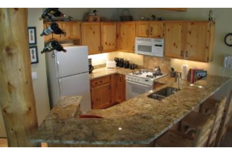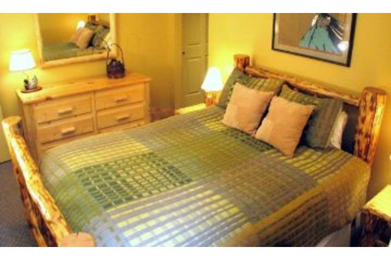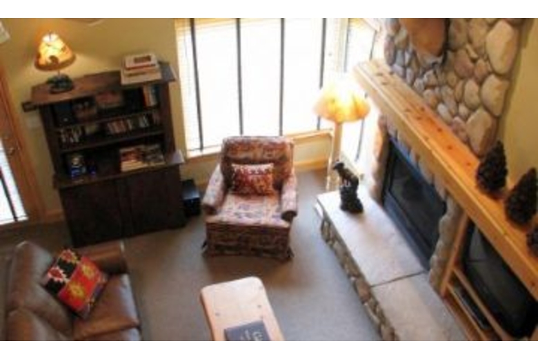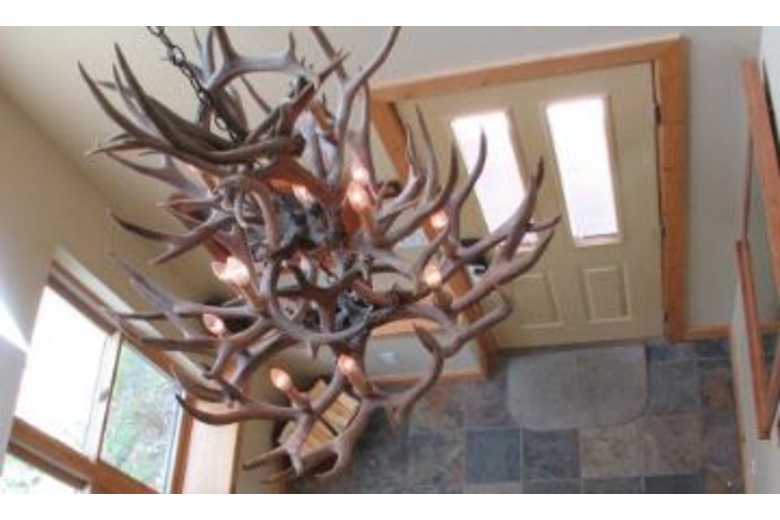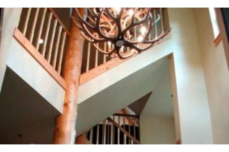 You walk into a three-story high slate-tiled area with a beautiful antler chandelier. There is one bedroom and bath on this level. Going up one level on the stunning wooden staircase leads to the living/dining/kitchen area and second bedroom and full bath. On the top level, enjoy the huge master bedroom with sitting area and aspen king bed, jetted tub and separate shower.Surrounding Description