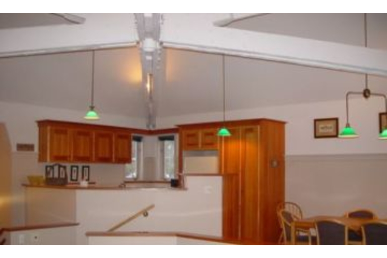 There are three bedrooms spread on two levels of this elegant home. Upstairs is a sunny great room with great beams and windows all around, a dining room and the great kitchen. Downstairs boasts the bedrooms. There is a large master suite with king bed, the second bedroom has a double bed and the third has two twin beds.Surrounding Description