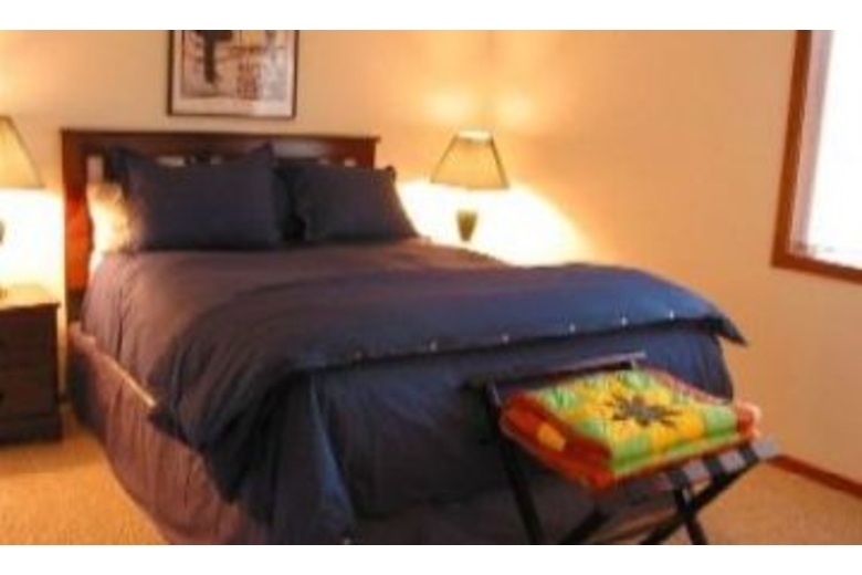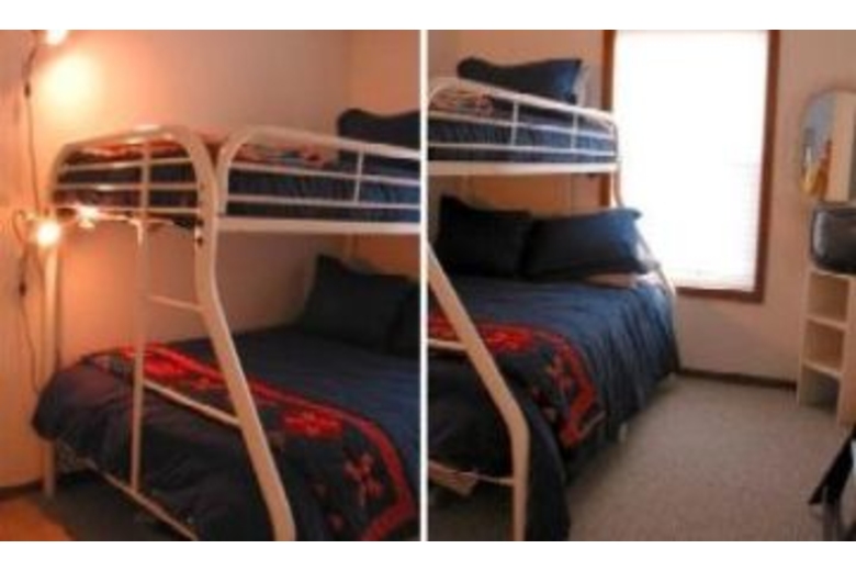 The ground floor includes a two car garage, bedroom with a queen bed and lounge area with a futon and small tv. The second floor is the dining room,living room, kitchen, master suite with queen bed and full bath, guest bedroom with twin/full bunk bed,and half bath.Surrounding Description