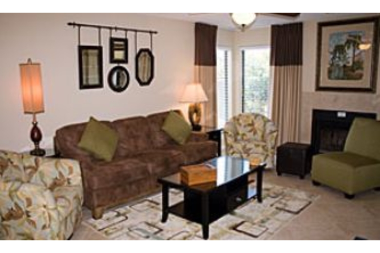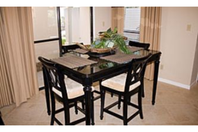 This two bedroom, two bath townhome features a living area with a queen sofa bed, coffee table, fireplace, and two armchairs. Here you can relax and enjoy a movie with the inclusive DVD rentals! There is also cable TV, wireless internet, and DVD player. The dining area has a beautiful black rectangular table with four black chairs around it. The kitchen comes fully equipped with everything you need to stock up on and enjoy your favorite foods. The master bedroom has a king bed, two nightstands, and a mirrored closet. The second bedroom features two twin beds, a nightstand with an alarm clock, and framed artwork above each bed. For your convenience there is a full-size washer and dryer in this unit.Surrounding Description
