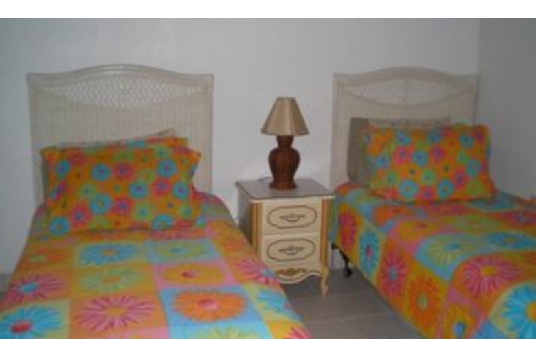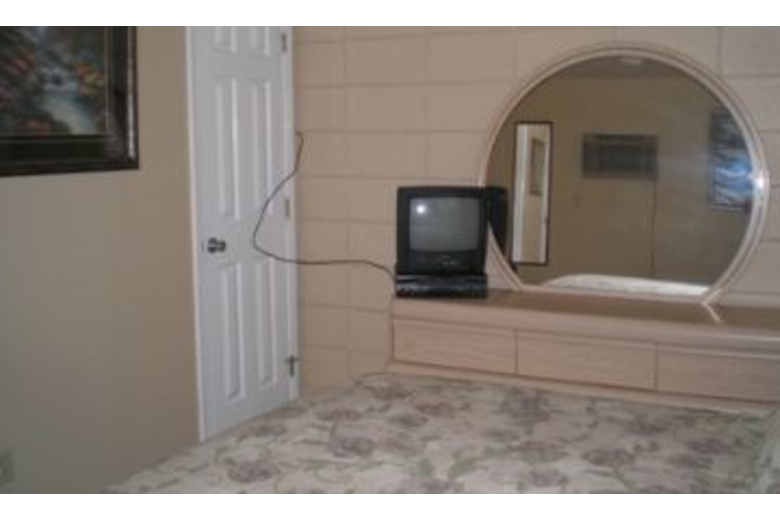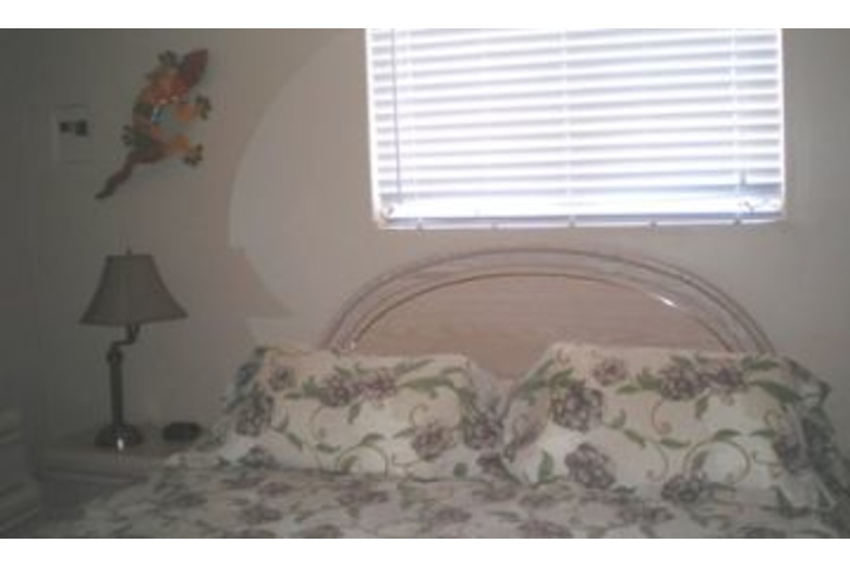 The master bedroom in this nice home has a king bed and a nice window to let the sunshine filter in. There is also a small TV. The second bedroom has two twin beds and is decorated in bright colors. The living , dining and kitchen area are open, perfect for a family to be together. The kitchen has a microwave and the living area has outdoor access.Surrounding Description