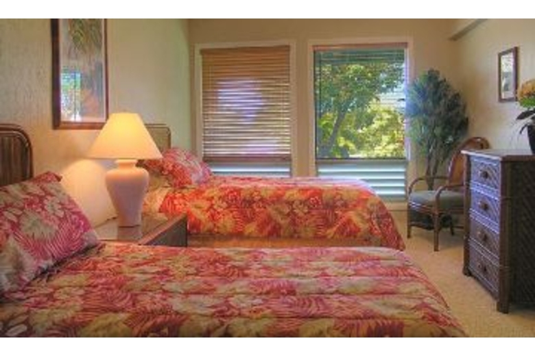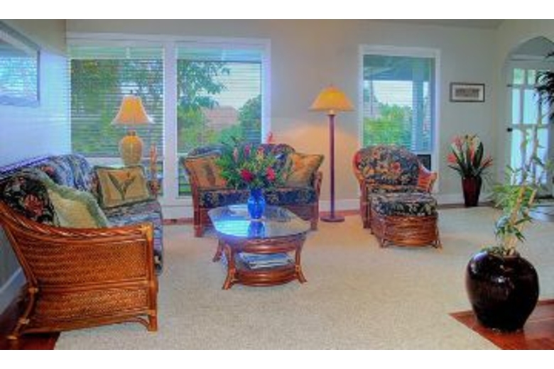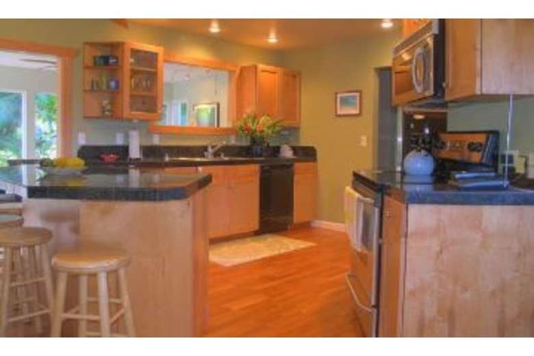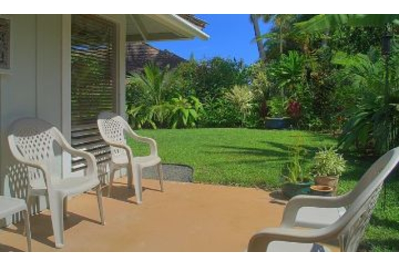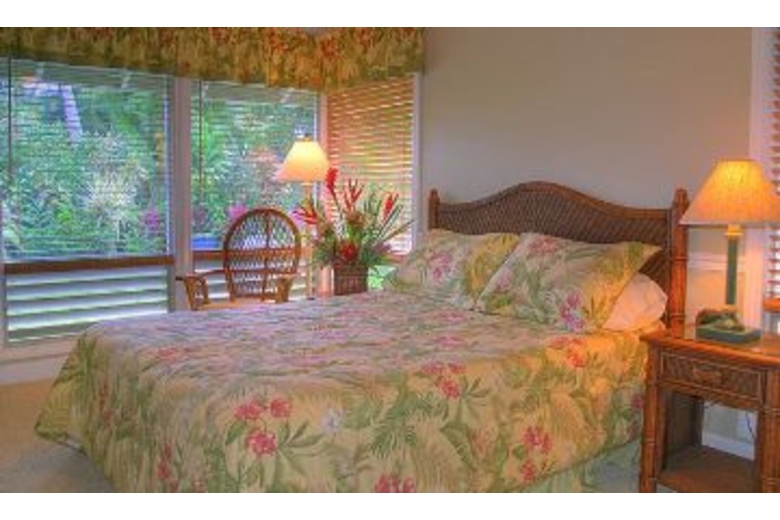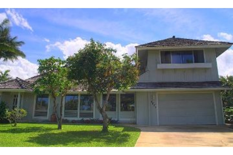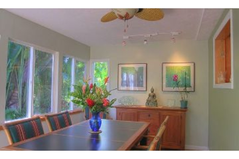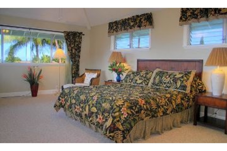 This vacation home features three bedrooms and three and a half bathrooms. The very private upstairs master suite has a king size bed with distant ocean & Bali Hai views. A second master suite has a queen size bed, Travertine tile bathroom with Jacuzzi tub, and looks out onto the backyard garden. The third bedroom has twin beds and a view of the front tropical landscape. The open living room flows into the fully equipped family size kitchen with stainless appliances and granite counters. The dining room is all windows overlooking the back lanai. Tropical flowers and foliage abound and compliment all views. Sleeps 6.Surrounding Description