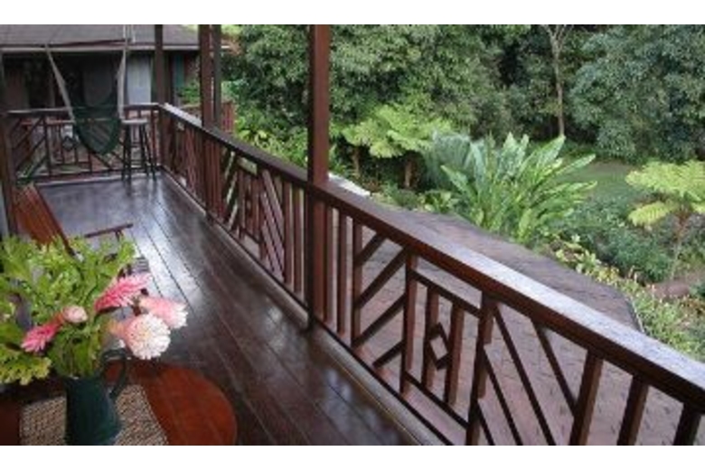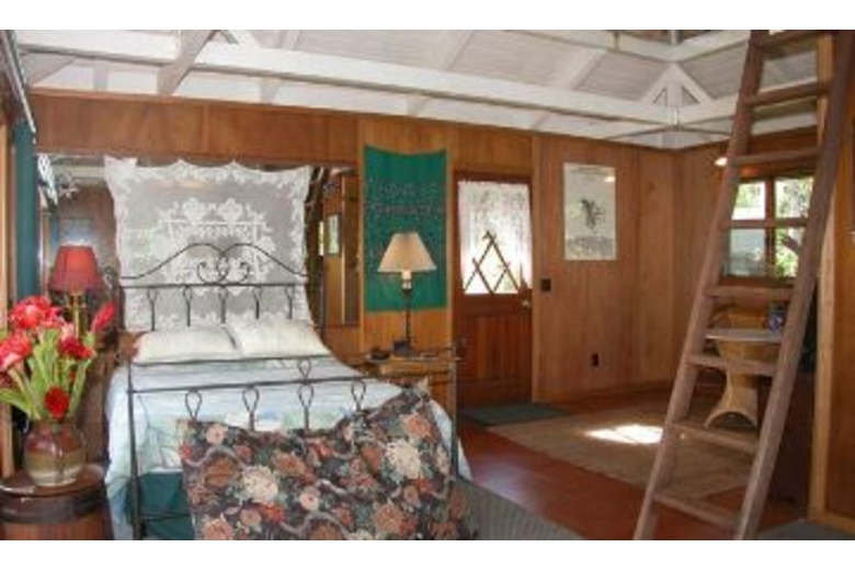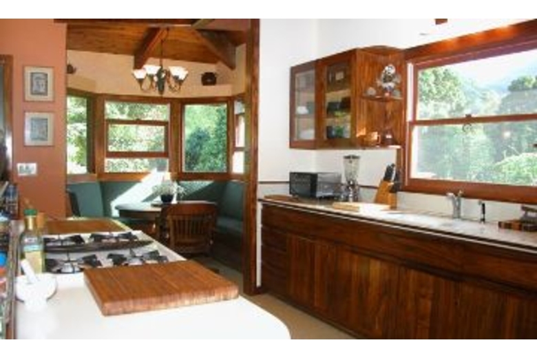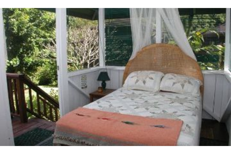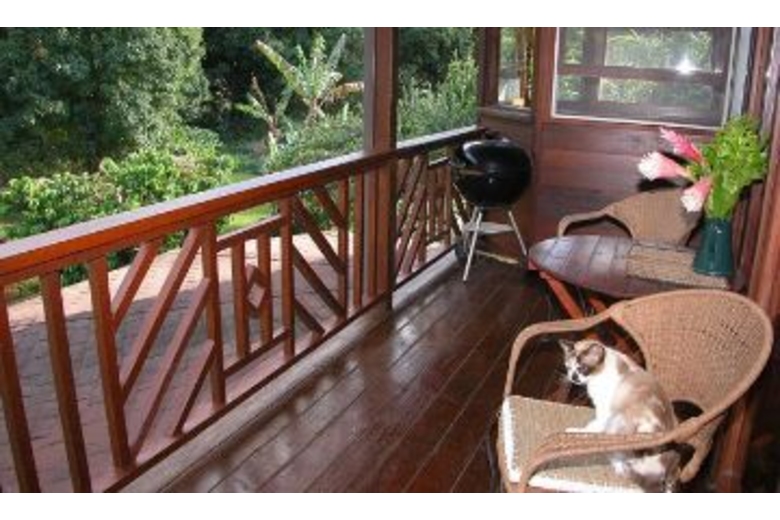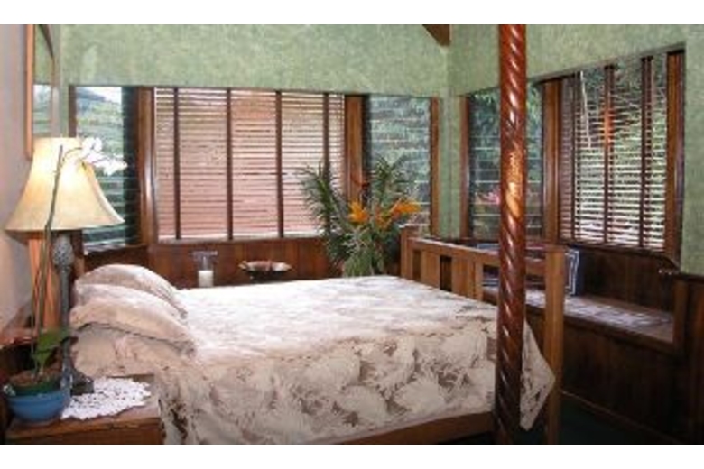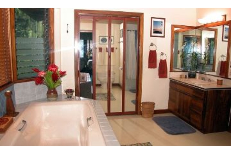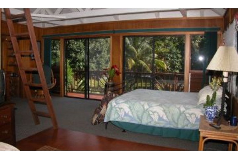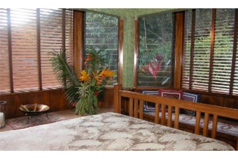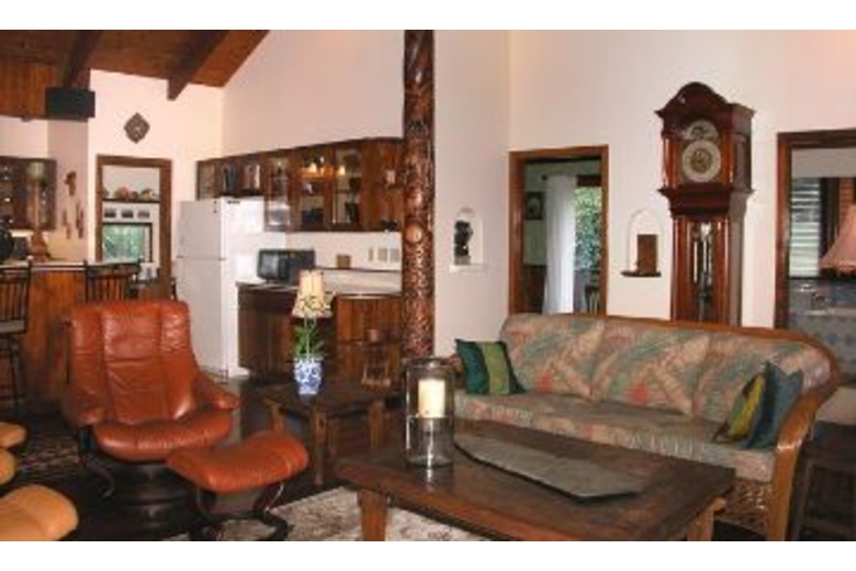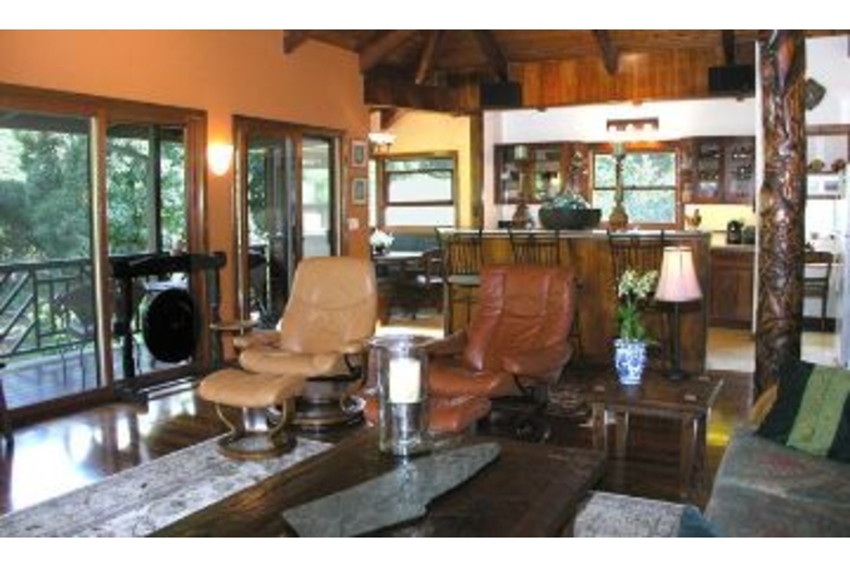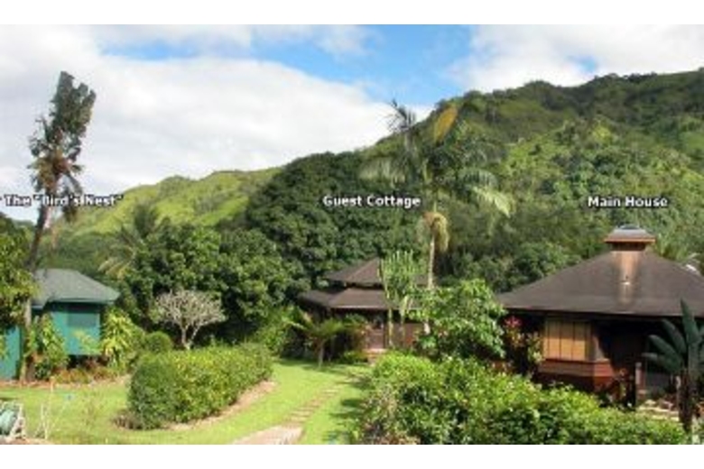 The home has three available dwellings that are not rented separately. The main house is an artisan-crafted dwelling with sandalwood floors and woodwork. It features an artistically carved central pole. The open floor plan is airy and comfortable with a unique décor. The kitchen becomes a central gathering spot with its cooking island and a gourmet kitchen. The dining nook provides a comfortable and intimate eating area. The bedroom has a queen bed and adjoins a spacious bathroom with a shower and an over-sized tub. The lanai overlooks the cascading water and flower-rimmed pools that are only 15 yards away. The spacious cottage is blessed with an outstanding view of the streams and the sound of the water creates a peaceful background lullaby. In the distance a waterfall cascades from the mountains. There is a queen size bed and a full bathroom. And then there is "the Bird's Nest." Often this small screened gazebo is the favored sleeping option with its living-in-the-jungle feel, views of the nearby wild mountains and early morning serenade of birdsong. The "Bird's Nest" has a full sized bed and half bath.Surrounding Description
