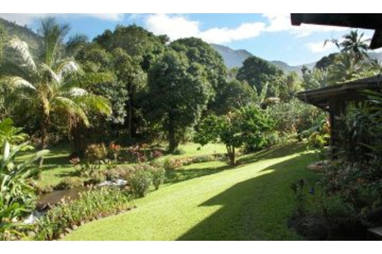 Unusual, intimate and a little wild [and quite unique], A River House is situated in the Wainiha Valley, one of the last strongholds of old Kauai. Wai is the Hawaiian word for water and water is indeed the focal point of this home. From the lanai, two watercourses are immediately evident: a stream cascading melodically into three pools and a wild rockstrewn river roiling its way down to the nearby ocean beach. The flowing waters immediately fill your senses with their peaceful music and are situated amidst the privacy of three incredibly verdant acres. After a hot day on the beach or the trail, a retreat to the cooling breezes and peaceful water song of this magical garden spot is always most welcome. Sometimes an entire day can be whiled away at A River House when the hammock beckons and where the jungle is at your backdoor.