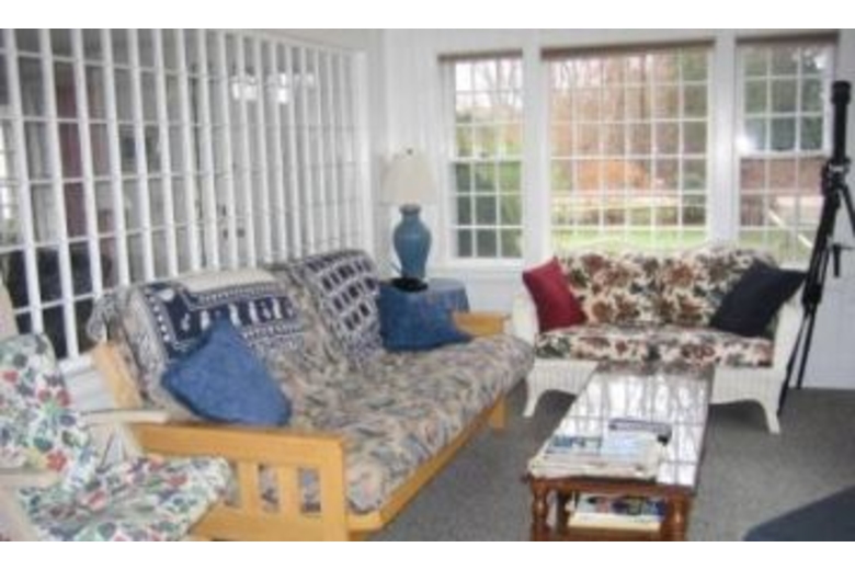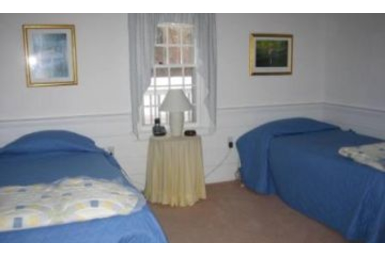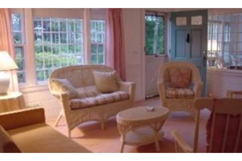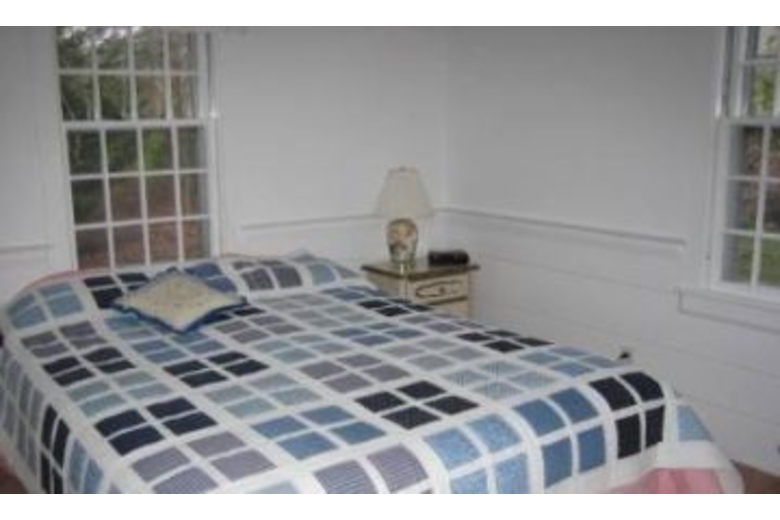 WIth two bedrooms, one and a half baths this home can accommodate five guests. It is located on a large lot down a country road. The living area has a sofa, loveseat, two chairs and a wooden rocker plus a fireplace. In the nearby sunroom you'll find cable TV, a VCR and a stereo plus a futon for one extra guest. The kitchen includes a microwave and dishwasher plus other convenient appliances. The dining area seats six and is adjacent to the kitchen. There's an outside shower, barbecue grill and a deck. The master bedroom has a queen size bed with a block-patch quilt, a nightstand, lamp and an alarm clock. The second bedroom has two twin beds in blue and yellow, framed artwork plus a small table with a lamp and an alarm clock.Surrounding Description