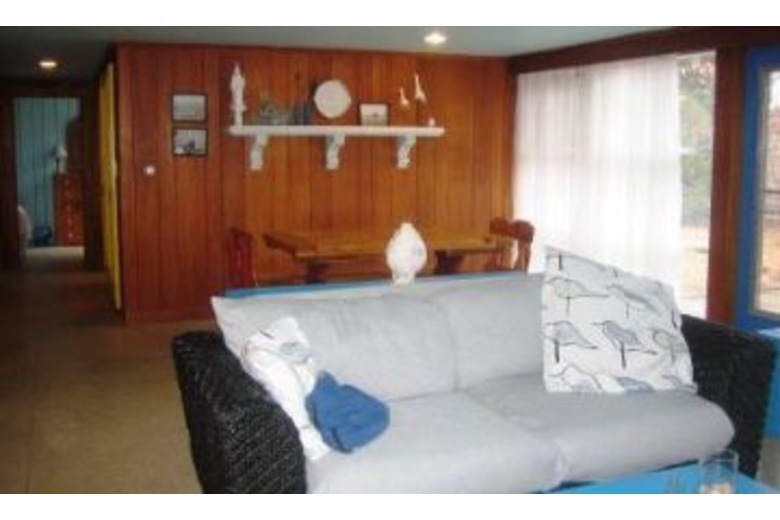 With three bedrooms, one bath this home comfortably accommodates six. The living area has three sofas, a fireplace plus cable TV, a VCR and a CD stereo. The kitchen includes a microwave and dishwasher plus other convenient, small appliances. The dining area seats six and is part of the open living floor plan. The master bedroom has a queen size bed in black and white and faces the front yard. The second bedroom has a double bed in blue and white plus a separate entrance. The third bedroom has two twin beds, reading lamps, a four drawer chest and a framed mirror. The back patio has ample outdoor furniture and a barbecue grill. You'll also find an outdoor shower to rinse off the sand when returning from the beach.Surrounding Description