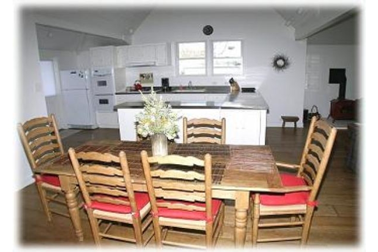 A large dining table is next to the kitchen