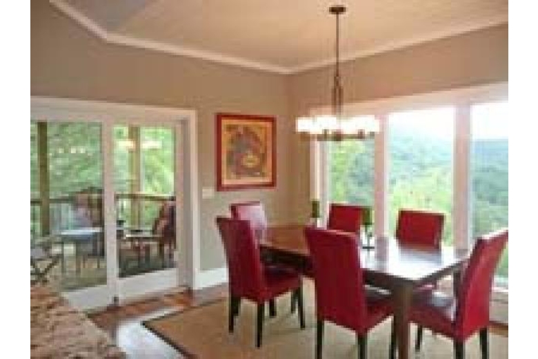Imagine spending your next mountain vacation in a luxurious home with the best views in Maggie Valley, the comforts of home, with lovely furnishings, many amenities, and easy access to everything. The Wrens' Nest is a new, 3500 square foot home and is stunning, inside and out. With 4 bedrooms + a bonus "dorm" room and 4 baths, The Wrens' Nest can sleep 12! The living-dining-kitchen area, separate game room, two open decks, and a large screened porch insure that there is plenty of space for everyone!The Wrens' Nest sits on a high ridge above Maggie Valley, 2 miles above Ghost Town and 2 miles below the Cataloochee Ski Area. The driveway is level, so you can drive into the garage and walk into the house without carrying luggage and groceries up a flight of stairs. The main living area consists of a spacious living-dining-kitchen space, master suite, office, laundry/mud room, deck, and covered porch. The living area boasts 25 foot wood ceilings, walnut floors, fabulous galley kitchen with a huge granite island, wood burning fireplace, bar, and long mountain views from every window. The master suite is a peaceful retreat. The bedroom has a king bed, sitting area, large LCD TV and DVD player and spendid views of the mountains. Just outside is a 2-3 person hot tub! The master bath has a deep soaking tub, walk in shower, double vanity, TV, and best of all...heated floors!The decks on the main level greatly expand the living space, especially in summer and fall. We have a grilling deck with two grills, one gas and one charcoal, plus a large covered porch with cozy rockers and dining table, and the spacious rear deck with lots of seating, views, and the hot tub!