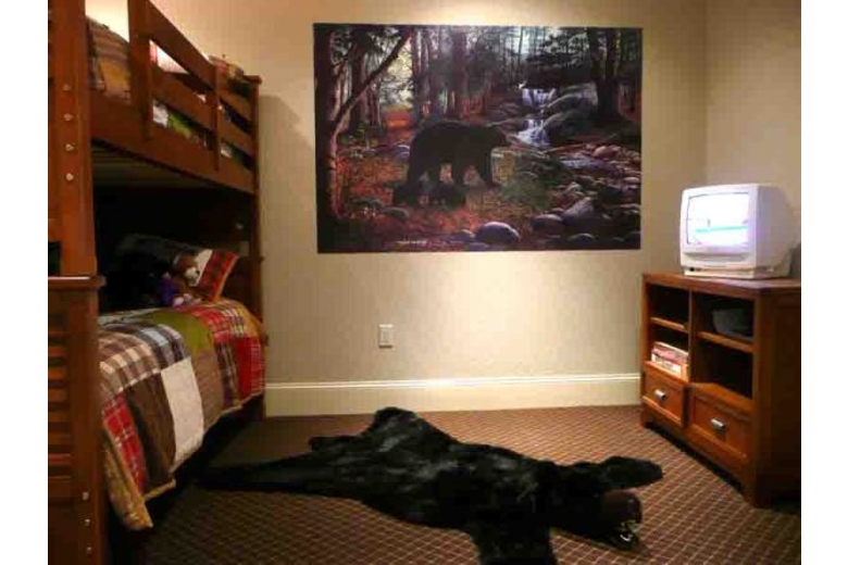 On the lower level is a spacious game room with large flat screen TV, game table, wet bar, and lots of comfy seating. Three additional bedrooms, includinga super bunk room, and 2 baths complete this level. Two bedrooms and the game room open onto a long covered porch and the mountain views beyond!