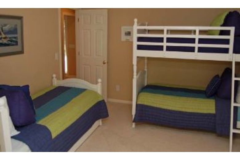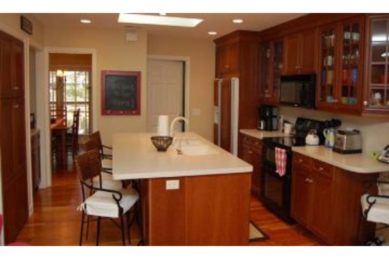 This home has it all! The living room features beautiful hardwood floors, sofa and loveseat, TV, DVD, fireplace and multiple doors to the back brick patio. The dining room has seating for up to ten. The kitchen has updated cabinetry and countertops, large island with sink and a double oven. The den opens up to the kitchen and has a TV, DVD, large sofa and overstuffed chair. The master suite has a king bed, large chair, TV. There is a private bath with a shower and Jacuzzi tub. The second bedroom has a twin, a trundle and a twin bunk bed with TV/DVD. The third bedroom has a queen bed with TV and shares a bath with bedroom 2, which has a shower/tub combo, two sinks and can be accessed from both bathrooms and the hall. The large backyard has a gas grill private patio and access to the bike path.Surrounding Description