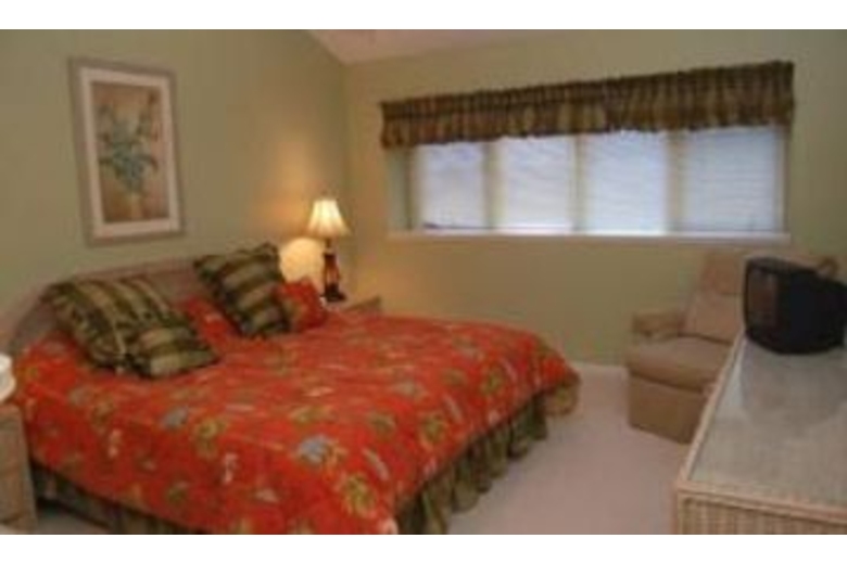 The living room is furnished with a sofa, love seat, two chairs, TV, VCR/DVD player, and slider to golf view deck. The updated kitchen has a table for four and opens to the Carolina Room with a game table for two and gorgeous golf views. The golf view back deck has a dining table for four. The first bedroom is located upon the entrance and has a king bed, chair, TV, and tub/shower combination. The second bedroom has a king swing bed and a private bath with shower that can also be used as a hall bath. Fourteen steps lead to the second floor with two twins, chair, TV, and slider to private balcony with golf view and table for two.Surrounding Description