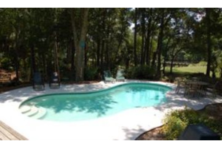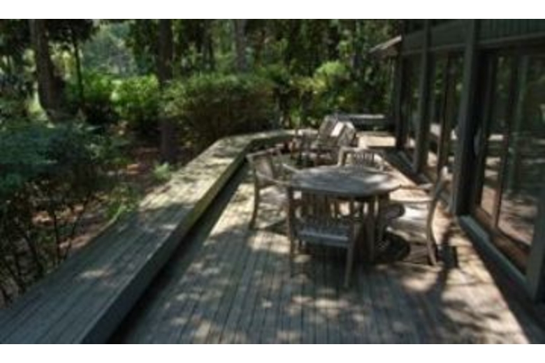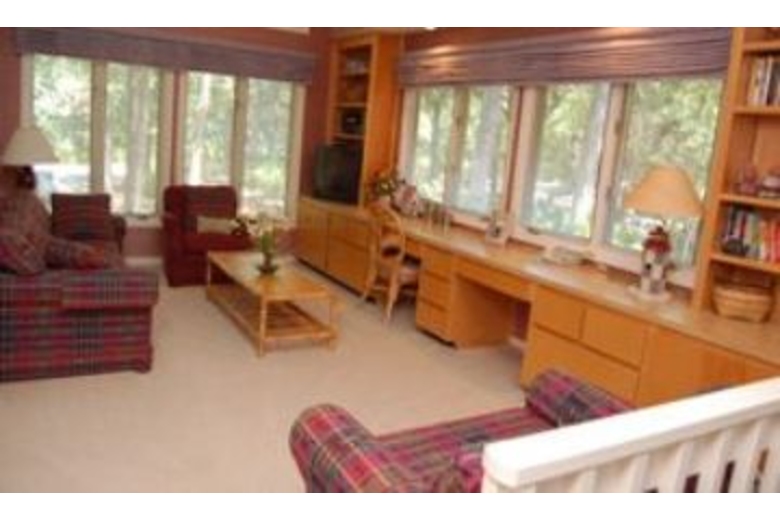 The very private master suite has a king bed, TV, VCR, and private bath with jacuzzi tub. The second bedroom has a queen bed, its own TV, and private bath. The third bedroom is over the garage, and has two double beds and a TV. It also has a private bath, and an adjacent study offers a queen sleeper sofa, love seat, and TV/VCR. Added features of this Hilton Head home include many skylights, full size washer and dryer, grill, premium cable channels on all TV's, pool, an expansive deck, and a private dock on the lagoon.Surrounding Description