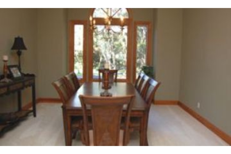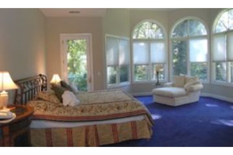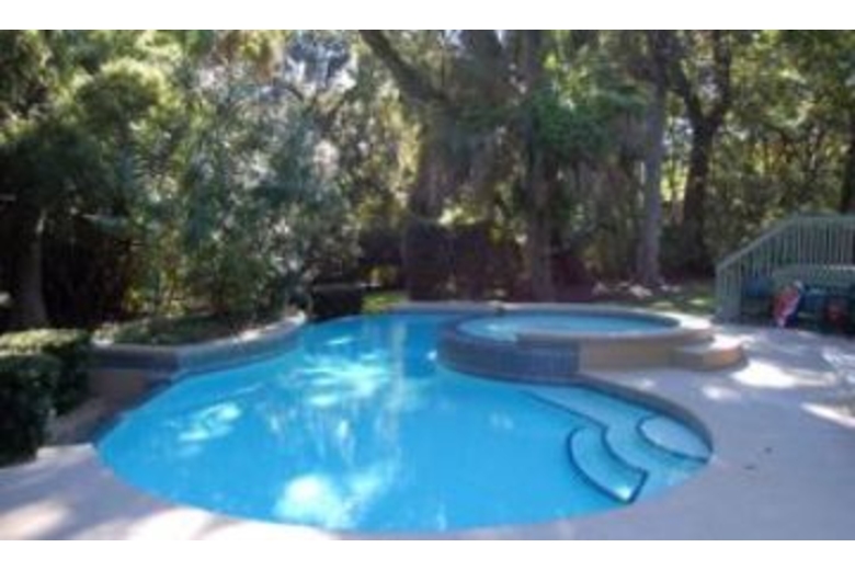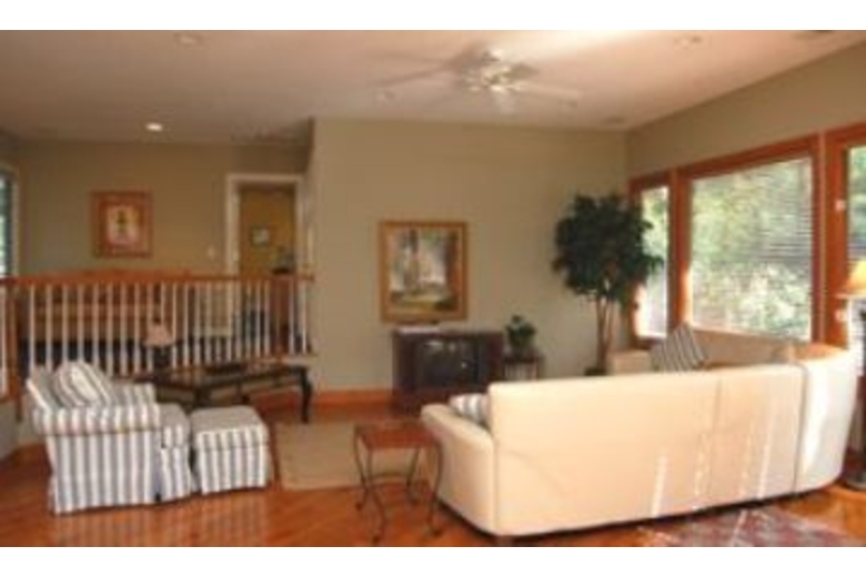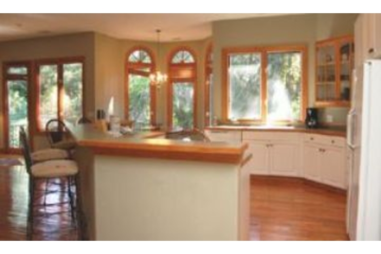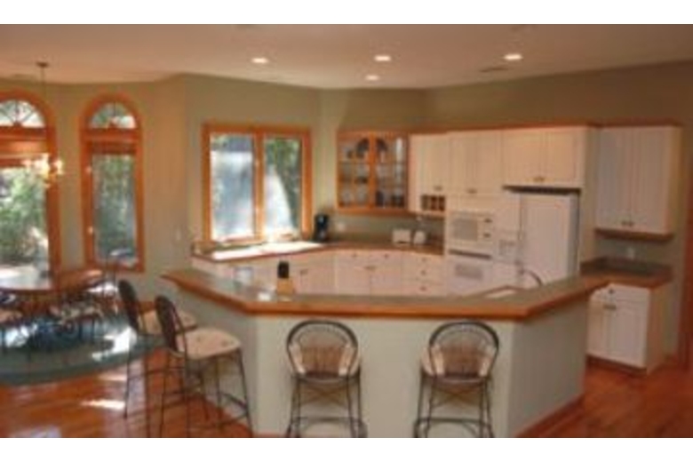 The living room has vaulted ceilings, two matching sofas and breakfast table for four. There is also a stereo, matching coffee table and decorative fireplace. The dining room is off the kitchen and across from the living room and has a wooden table with seating for eight looking out to the front of home. The den is located off the kitchen and has a white leather sectional sofa with blue and white striped chair, TV, VCR and DVD player with views of the pool. The newly remodeled and open kitchen has hardwood floors, white cabinets and white GE appliances. There is bar seating for four. Guests can also sit at the breakfast area with seating for four that overlooks the pool. Three steps up from the den lead to a lounging area with a sleeper sofa. The first bedroom has a queen bed, TV and windows looking out to the pool. The second bedroom has two twins, TV and VCR. Bedrooms 1 and 2 share a bathroom that has a tub/shower combination. The spacious Master suite is located on the opposite side of the home. The master has vaulted ceilings, king bed, TV, VCR and DVD player. The master also has a private bathroom with Jacuzzi tub, glass shower, vaulted ceilings and large vanity area with walk-in closet. The master bedroom has a private deck that looks out to the backyard and pool area. The deck and backyard of this home are perfect for every vacationer's needs. There you will find a gas grill and glass table with seating for four. Six steps from there is a large kidney shaped pool. There are four lounge chairs and an outdoor shower as well as two regular sized chairs with beverage cart. This outdoor area is perfect for family get togethers and the kids! DSL is available for guests at no additional charge.Surrounding Description