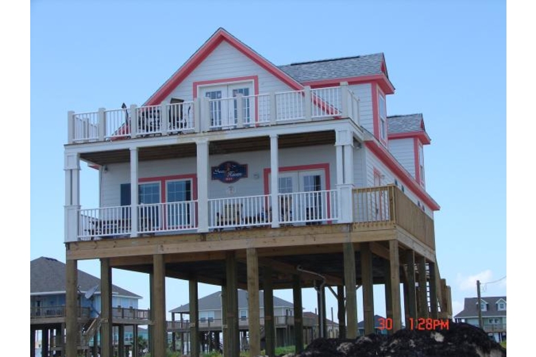 Ike took it away but we put it back, better than ever! New in 2010 Beach front home with beautiful sunrises and sunsets. Available starting Memorial Day Weekend. Great location in Crystal Beach. Family oriented with a large 'kids' room with 3 bunk beds and play area. There is a main floor living room and upper level game room with wet bar for the adults plus a fully equipped kitchen and on site laundry.