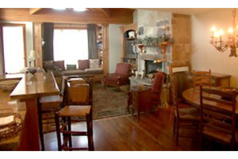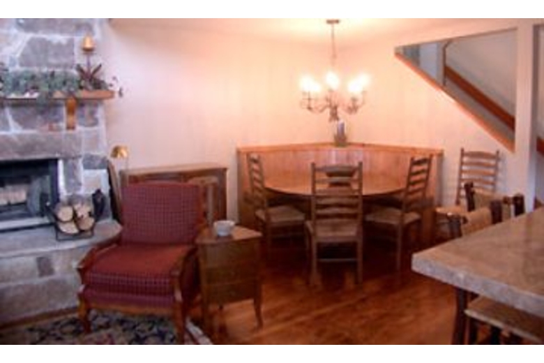 This townhome has three bedrooms, three and a half baths plus hardwood floors. The first bedroom has a king bed and TV. In the second bedroom you will find a queen bed. The third bedroom comes with two twin beds. There is a fully equipped kitchen has a breakfast bar with extra seating, coffee maker, toaster, microwave, ice maker and dishwasher. The dining area has a round table with two benches and three chairs. The living area has a DVD player, TV, double sofa sleeper and wood-burning fireplace.Surrounding Description
