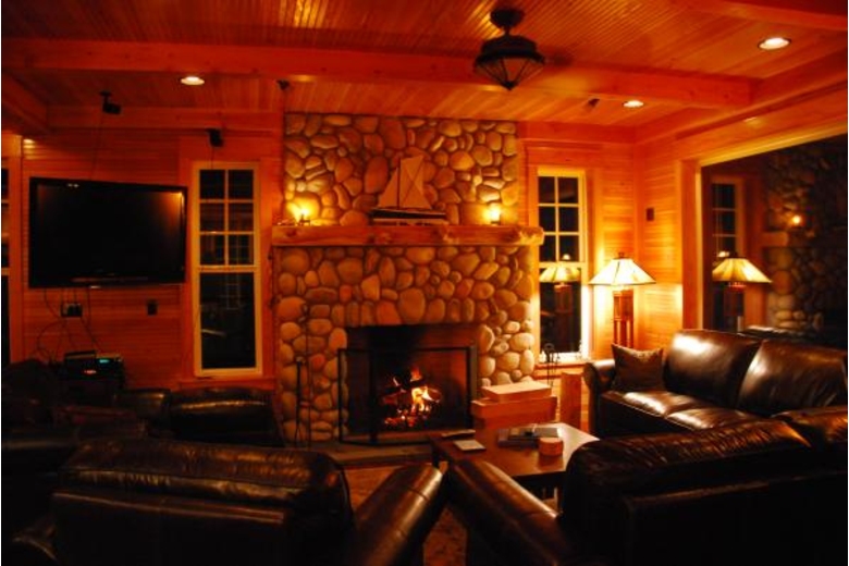 1st floor living room w/ river rock fireplace