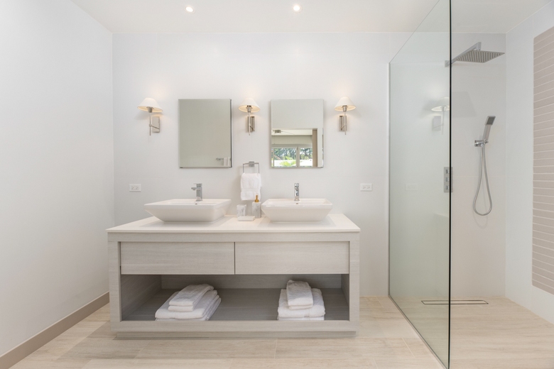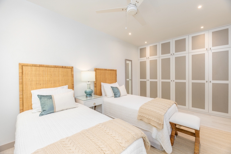 The Guest bedrooms are airy and beautifully decorated with high-quality bed linen. Bedroom 2 boasts a king-sized bed and an ensuite with a single vanity and walk-in shower. Bedroom 3 offers two single beds with an adjacent bathroom featuring a single vanity and tub/shower.