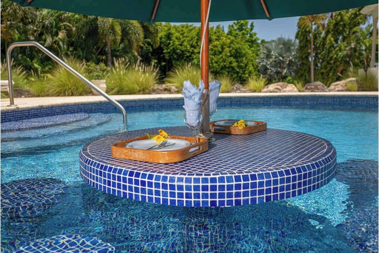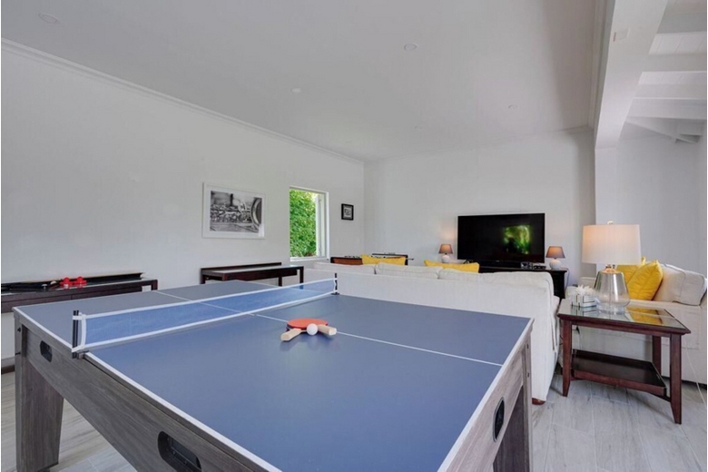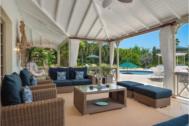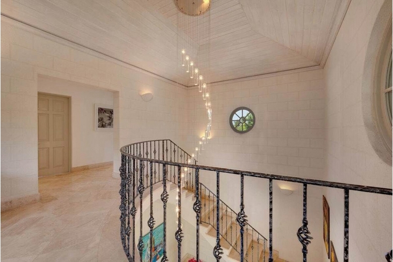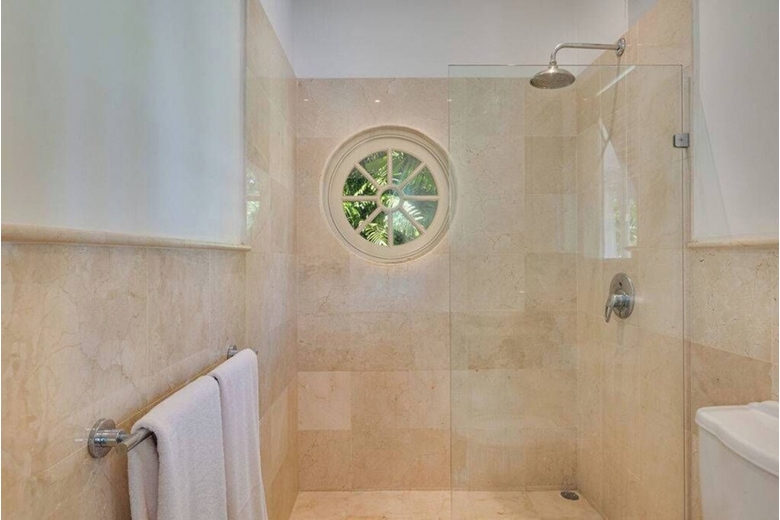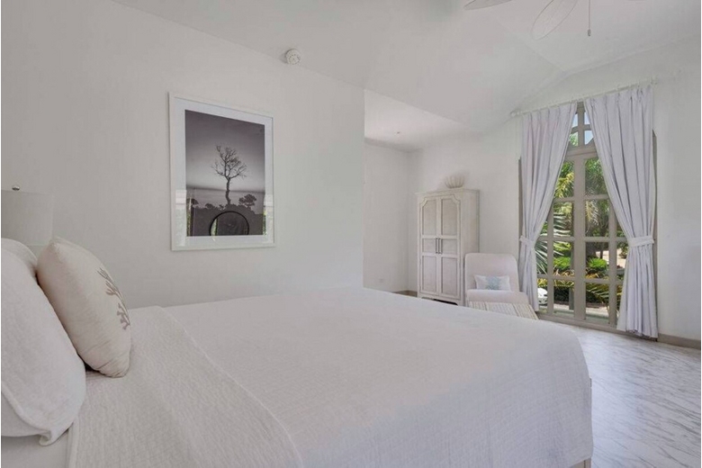 The villa features the main house with four spacious bedrooms, each designed with exquisite detail and comfort in mind. A charming two-bedroom guest cottage offers additional accommodations, perfect for visitors or extended family. Outdoor living is a highlight, with a large pool and multiple lounging areas, ideal for relaxation or entertaining.