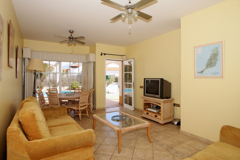 The villa lounge, dining areas is beautifully furnished using traditional natural Canarian style furniture and provide a cool place to relax, dine watch the satellite TV / Video or listen to music (portable stereo provided).