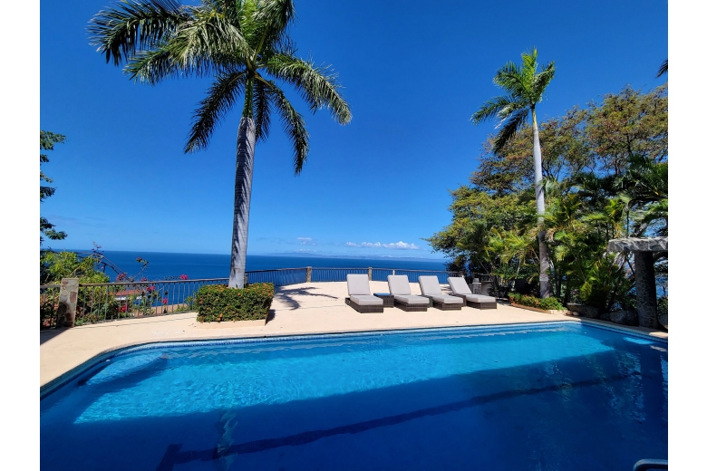 Private outdoor Swimming Pool and hot tub with views of ocean, private swimming pool, Private Outdoor Hot Tub, Ocean Views, Mountain View, Professionally Decorated, Fully Equipped Kitchen, TV, Microwave, Dishwasher, Utensils, Refrigerator, Bathtub, Shower, Soaps, Hair Dryers, Safes, Pool Towels, Deck, Patio, Patio Furniture, Telephone, In Room Safe, Parking Available, Linens Included, No Pets Allowed