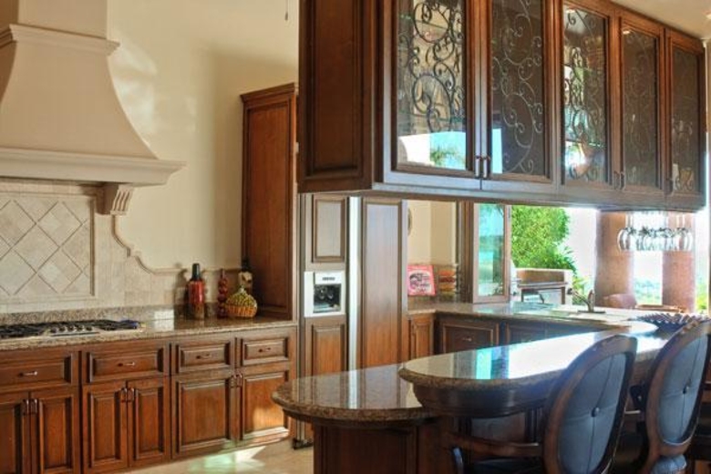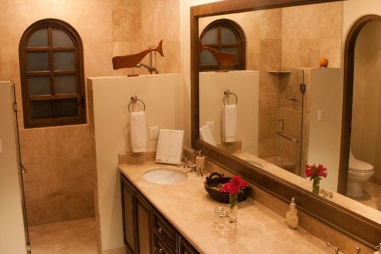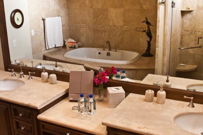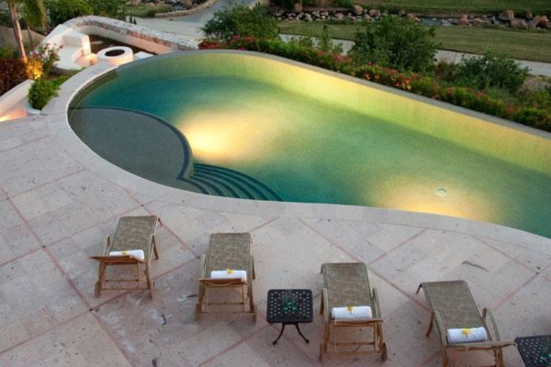 Villa XVIII is a 6000 sq.ft., 6 Bedrooms and 6.5 Bathrooms villa in Cabo del Sol overlooking the 18th hole on the Desert Course at Cabo del Sol, with views of the Sea of Cortez and Golf Club House. Featuring a gourmet kitchen, an impressive executive office, private caretakers quarters, pocket doors that open to huge terraces, infinity pool and pool side entertainment area. Cabo del Sol is a 10 minute drive to Cabo San Lucas town and it is a 15-20 minute walk to the beach. Cabo XVIII doesn´t have a golf cart. However, we may arrange this service at 65 usd per day including gasoline. It would be a large golf cart with capacity for 6 people.