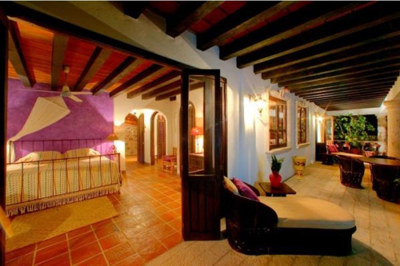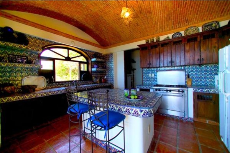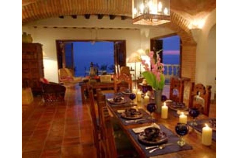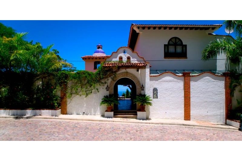 Casa del Quetzal is a luxury five bedroom, 5 1/2 bath, 3 level, approximately 8000 square foot hacienda style Mexican colonial home. It is situated in the heights of Conchas Chinas, Puerto Vallarta (five minutes from the beach and seven minutes from downtown) with a spectacular view overlooking the Bay of Banderas. The large entry courtyard is adjacent to a stone columned loggia with beamed ceilings. A path from the courtyard leads to a garden below. A large living room and dining room open to a view of the bay, courtyard, and patio fountain. The dining room, kitchen, and stairway have antique colonial brick ceilings. All bedrooms and baths are air conditioned and give dramatic vistas of the ocean. The large master bedroom has a Jacuzzi bath. The thirty-five foot decorative infinity style pool overlooks the Bay. The hacienda is fully staffed with a maid and a cook.