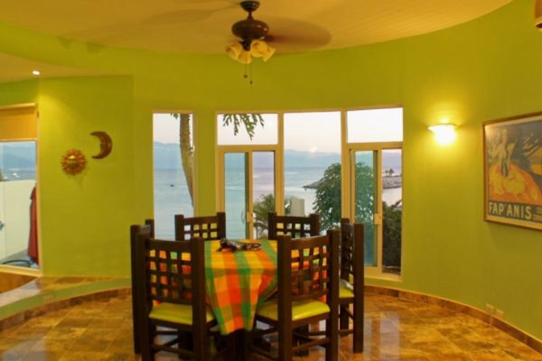Entering, you'll pass the mexican kitchen to find yourself in the circular dining room with a table seats up to eight, complete with views of the pool and marina. Left, you'll see the sunken living room, with more windows to bring in the ocean view.