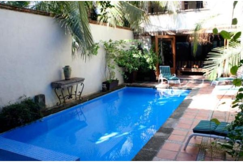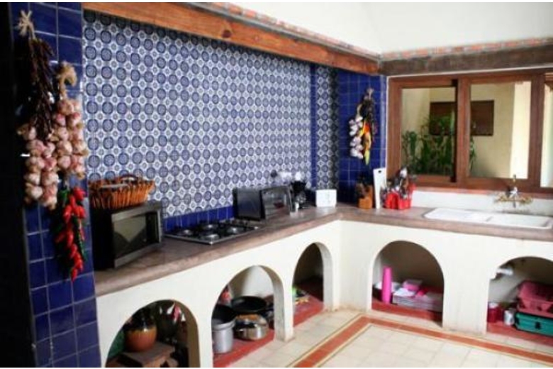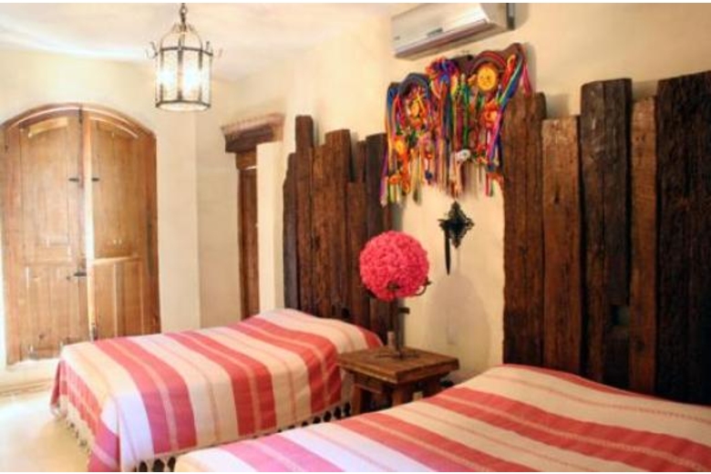 Hacienda Daniela in Sayulita. A true Hacienda-style house in tropical Paradise. This house transports you into another world were you get an old world atmosphere with all the true modern convince. This house is located in north Sayulita, just two blocks from the beach and “left†surf break. This house has been constructed in pure Mexican hacienda style, offering a combination of Spanish construction techniques and Pre-Hispanic methods and  handmade artwork all over the place, from the floors to the decoration.The hacienda layout is based upon the classic form of a central patio (historically used to collect rain water) but now giving the house an incredible privacy plus  natural sunlight and ventilation without necessary looking at the street. The construction is made out of antique materials including 100+ year-old wooden beams, stone facades from old colonial buildings, gigantic stone columns brought from different parts of Mexico and a very articulate handcrafted construction to perfectly accentuate this very special construction style.