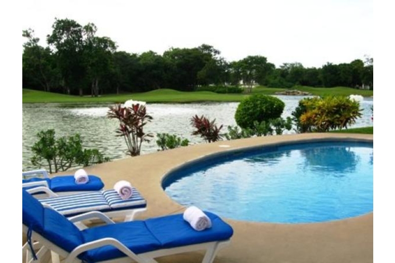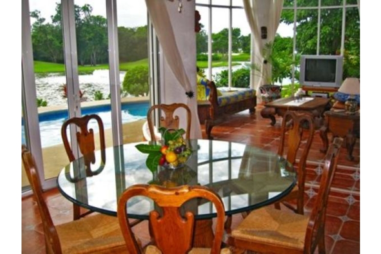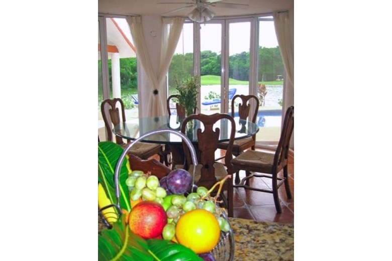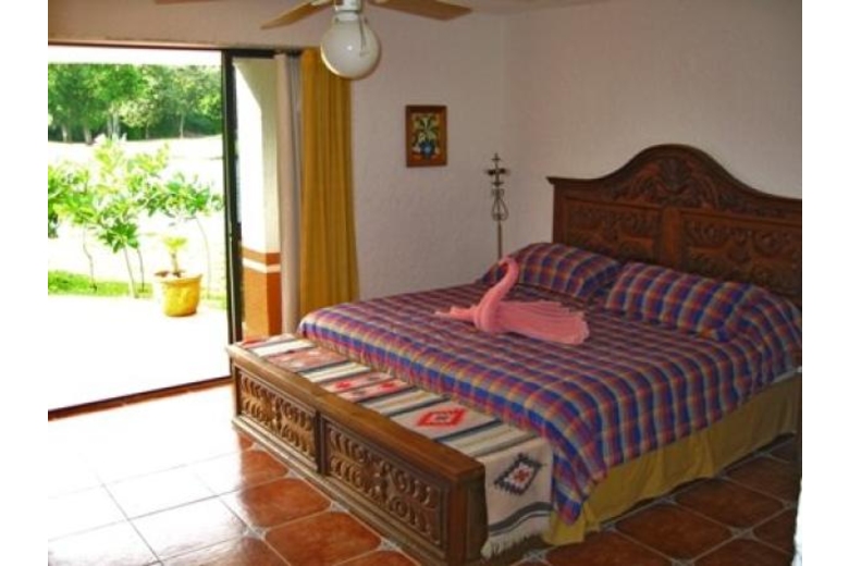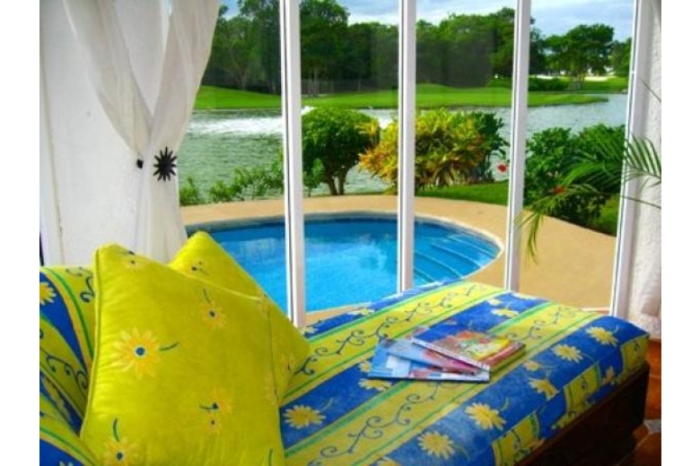 Villa Azucena is a spacious 3 bedroom, four and a half bath villa with not only a private pool, but also a fantastic view of one of the prettiest lakes on the 18 Hole Von Hagge Championship Golf Course. One of the exclusive Villas del Mayab homes located in the Playacar Phase II community of Playa del Carmen, it is just a three minute walk from the white, sandy beaches and turquoise waters of the Caribbean, as well as bustling downtown Playa del Carmen where you will find the most popular restaurants, bars and shopping around.Beautifully decorated in the Spanish style with elegant, custom-made mahogany furnishings, Villa Azucena definitely exceeds your expectations! On the first floor is a large bedroom with King size bed and private bath, a fully equipped and recently remodeled kitchen with separate dining and living area. There is also a smaller bedroom with bunk beds just perfect for the kids. From almost the entire first floor, you have an excellent view of the lakeside pool and golf course.On the second floor you find the spacious Master bedroom with King size bed, as well as another guest bedroom with twin beds which can be joined to make an additional King bed. Both bedrooms have private baths and large walk in closets. Villa Azucena is everything you could hope for and more! Fully air conditioned, satellite TV, VCR and BBQ grill are just a few of the amenities. You also have access to the Villas del Mayab tennis court and the large swimming pool through a shared garden area. Next door to the villa, is the Playacar Aviary where you can walk among numerous exotic birds.As a guest of the villa, you can participate in the all-inclusive benefits of the Reef Club Resort. With the VIP Guest card, you have access to beach towels and lounge chairs or you may opt for the half-day or full day all-inclusive package for a discounted fee.
