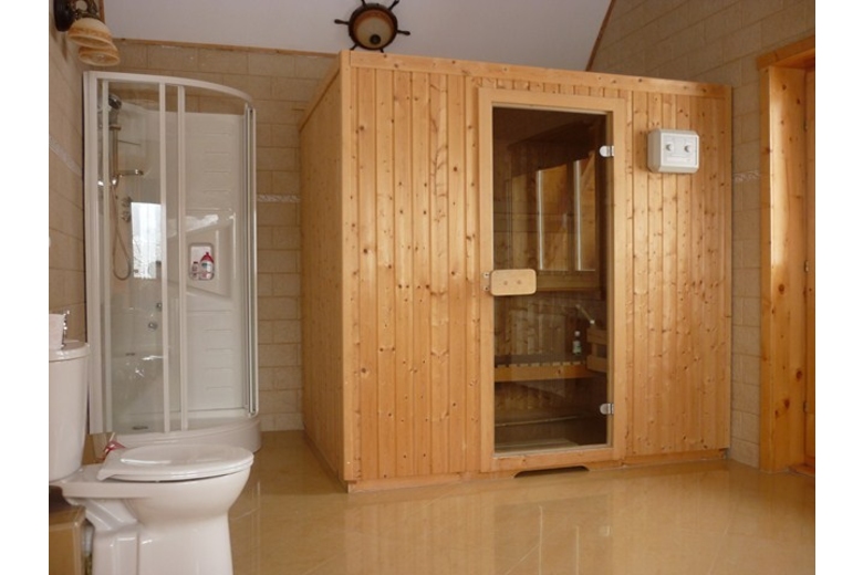 This villa is completely built of wood. On the ground floor you’ll find a large bedroom and a private bathroom with shower, toilet and sink. There is also a washing machine here. - On the first floor there is a large, bright living room with a fireplace. Along the entire length (12 m) of the living room there are windows and doors that open onto a spacious terrace. From the living room you have an unrestricted view of the surrounding low-lying farms and pastures. The living room is furnished with a large dining table, sofas and chairs, various decorations and a cozy fireplace. One of the sofas can be converted to a bed for two persons. The open kitchen is fully-equipped including a kettle, coffeemaker, 4-burner gas stove, electric oven, microwave, refrigerator and freezer. The master bedroom has a separate bathroom with shower, toilet and sink. -
