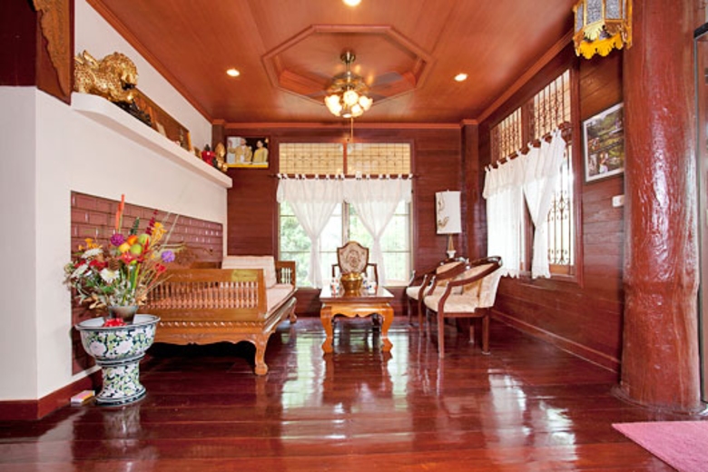 The living room is one of the best features of this house as its designed with an authentic Thai feel and gorgeous decor. This room is elegant, yet casual and furnished with traditional antique Thai furniture including; three chairs, two couches on either side of room, and coffee table. For the modern appeal the living room has recess lighting and tall, large windows throughout, and polished hardwood floors.
