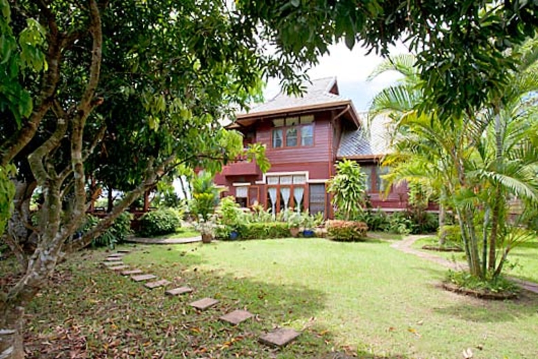 If you find yourself coming to Thailand seeking authenticity, it doesn't get more genuine then the Doi Saket Villa. Established at the end of a gated community, amongst rice fields, is a beautiful four-bedroom teak wood home. With views of the famous Doi Saket temple, mountains, and rice fields, this home is set in the most perfect location. As you drive through the opened iron gate, the cement driveway, with broken colorful tiles, leads you to the back of the house. The yard is lush with vegetation and palm trees while manicured bushes line the driveway. From the front of the house you can easily see the temple in the distance and if you make your way to the back of the house there is an exquisite teak wood sala for reading or taking in the spectacular surrounding views. Walking up the front staircase to the house is a porch with built-in benches that comfortably seats up to six people. When you and your guests wake up to have a fresh cup of coffee or want to wind down after a long day this intricately detailed front porch is the ideal spot for relaxing.