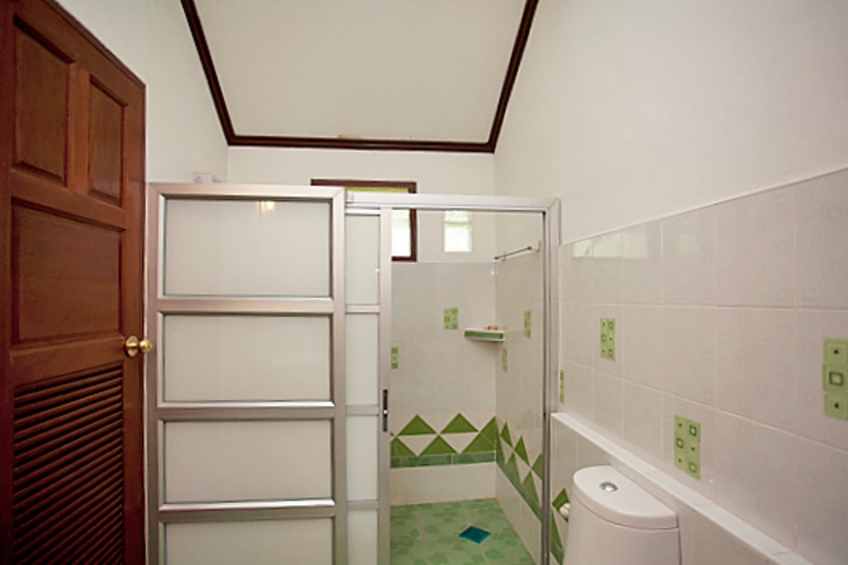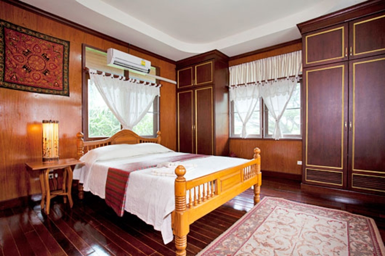 BedroomsAll four bedrooms are open, bright, simple, and classic with Thai art decor adorning the walls. Three of the bedrooms are located upstairs, while one guest bedroom is downstairs. The master bedroom is located upstairs and is the most attractive bedroom above the rest. This room oozes with romance the moment you notice the King-size bed. Made entirely of teak wood this four-poster bed frame has a canopy hanging above and two large windows surrounding. As the largest bedroom it also come furnished with a built-in wardrobe closet and large vanity space and mirror with an intricately designed wood frame. Other added bonuses to the master bedroom are an ensuite bathroom and small terrace that overlooks the rice fields behind the home. The last two guest bedrooms upstairs are both designed with Thai tapestry decor on the walls, Jack and Jill bathroom, and teak wood bed frames. Located on the second left of the hall is the first guest bedroom with a twin size bed and small vanity. On the right side of the hall is the second guest bedroom with a Queen-size bed, area rug, two built-in closets with ample space, and three large windows with one behind the bed overlooking endless views of rice fields and mountains. Lastly on the ground floor, off the kitchen, is the third guest bedroom with a King-size bed, antique dresser, stereo, phone, and a semi-ensuite shared guest bathroom.