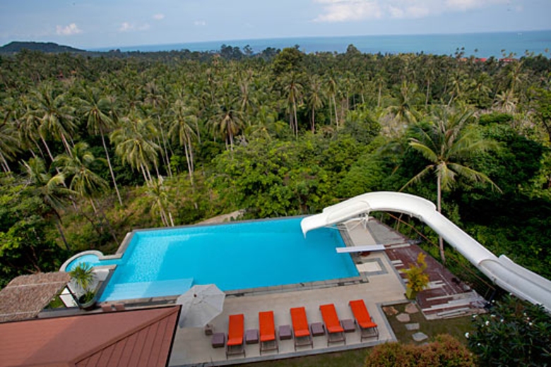 Imagine yourself surrounded by coconut palms on the lower slopes of tropical hills overlooking the Gulf of Siam relaxing around your own private water park with your family and guests having non-stop fun. This is Enchantment Villa, in island Koh Samui, where the enjoyment never stops. Climb three flights of stairs to the top-floor balcony and experience the thrill of descending at heart stopping speeds down the flume into the deep end (2.8m). This is also a child friendly villa with childrens games and a twin room with only DVDs on the flat screen. Adults games are also included with a full size pool table, and table football. The housekeeper, Daw, will prepare your included breakfast and any other meals that you may wish to buy and commission her for.