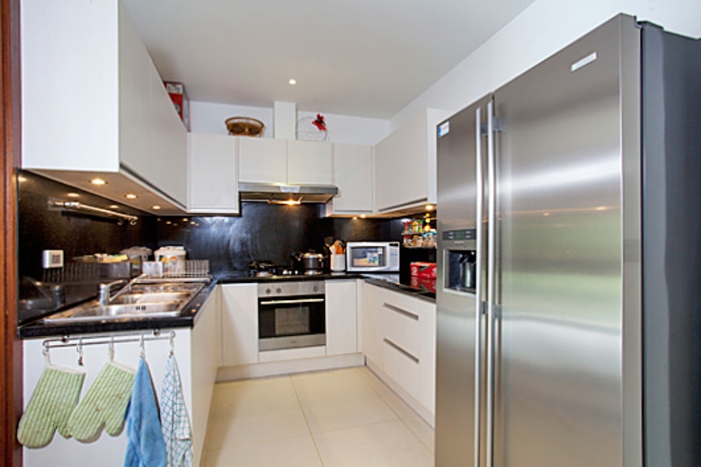 The living and the dining room has an open plan area with a sea facing balcony. The living room has a U shape sofa to relax in and is fitted with a modern fifty two inch flat screen with satellite channels, a DVD player and music system. The living area has ceiling fans as well as air-conditioning.