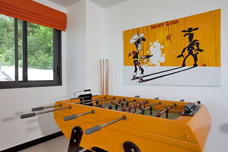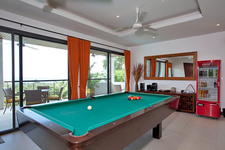 The villa has one bedroom on the same level as the living room with a large bathroom. On the first level there is a childrens game area, guest toilet and the games room. Each room is connected to a balcony which has the spectacular views of the bay. The top floor consists of the master bedroom, second and third guest room with twin beds and a king size bed respectively. Each room has an en-suite.