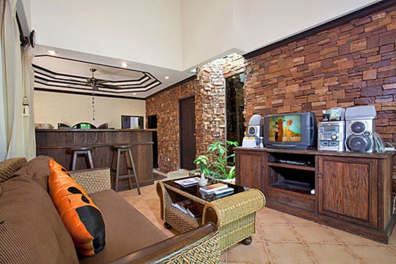 Lined with stone walled features, the living room is a great entertainment hub – a cable connected flat TV, a DVD player and a wicker settee facing a coffee table. The views of the garden are quite amiable from here.