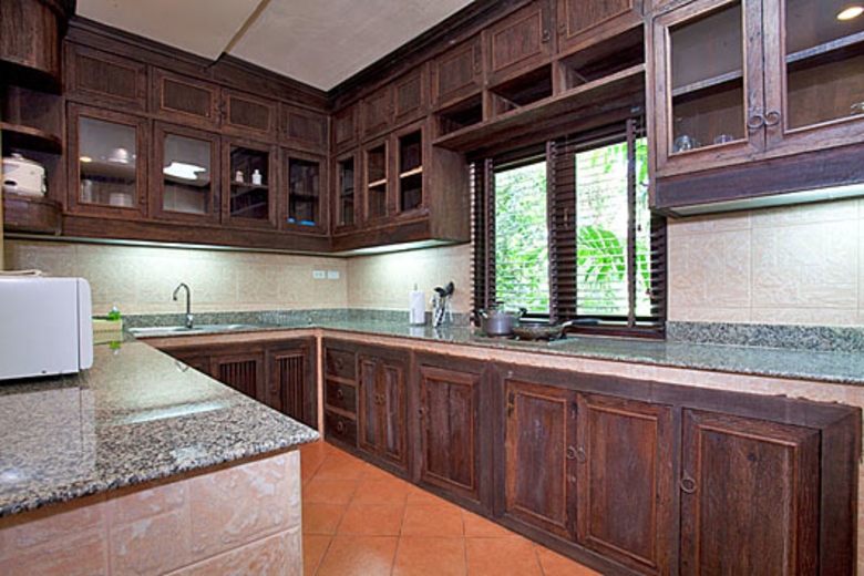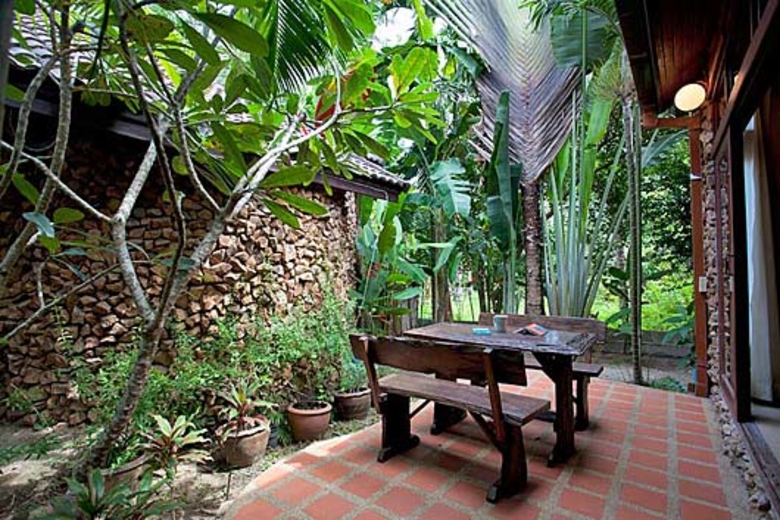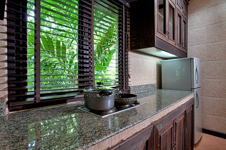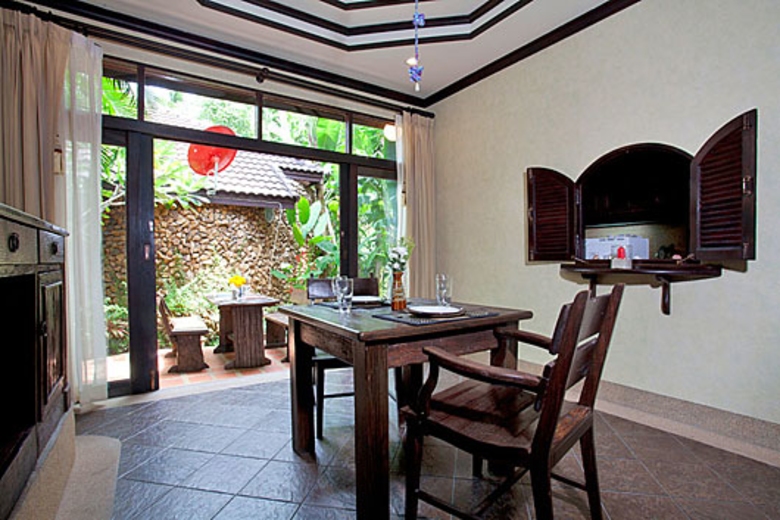 Nearer to the kitchen and located in a cosy corner of the living room, the kitchen can also be accessed through a wall hatch from the kitchen. It is decorated with a wooden dining table for two along with matching chairs. You can also opt for a more romantic dinner setting on the outer terrace which also has a wooden table overlooking the tropical gardens.