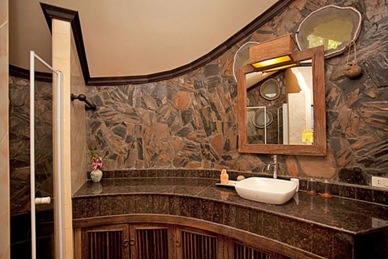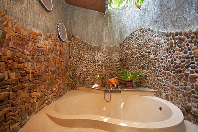Along with a private outdoor Jacuzzi, the bathroom is well fitted and comes with stoned walls to make it more natural. A shower, a wash basin and a toilet are fitted into in a symmetrical fashion.