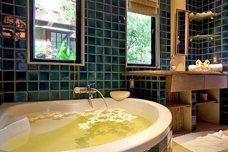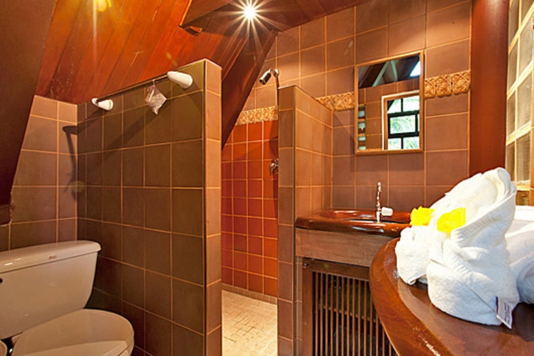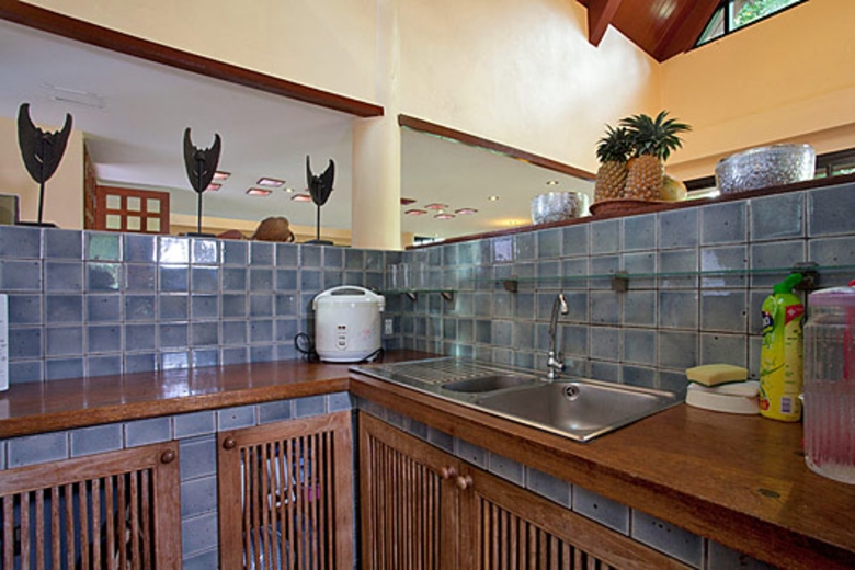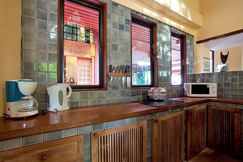 The unique kitchen is modern and western-styled, but with a distinctly Asian feel. Handmade worktops and cupboard doors add to this feel. There are stovetops, a freestanding microwave, a coffee maker, kettle, and a rice cooker to add to the normal range of facilities where you can rustle up tropical feasts in style.